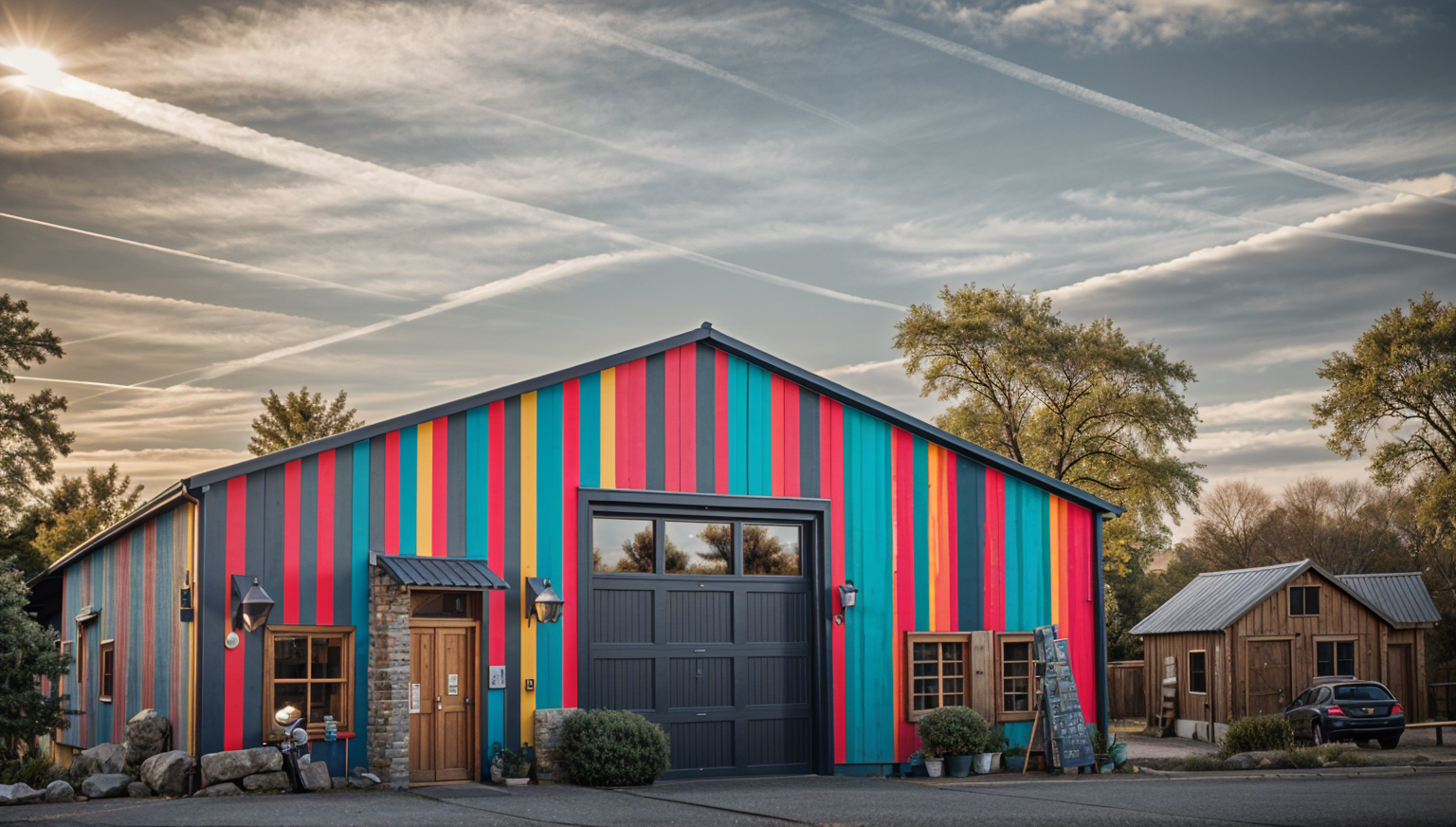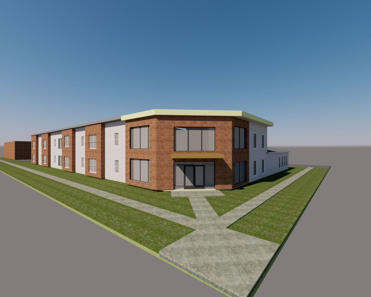 brick and mixed siding building from the corner architecture