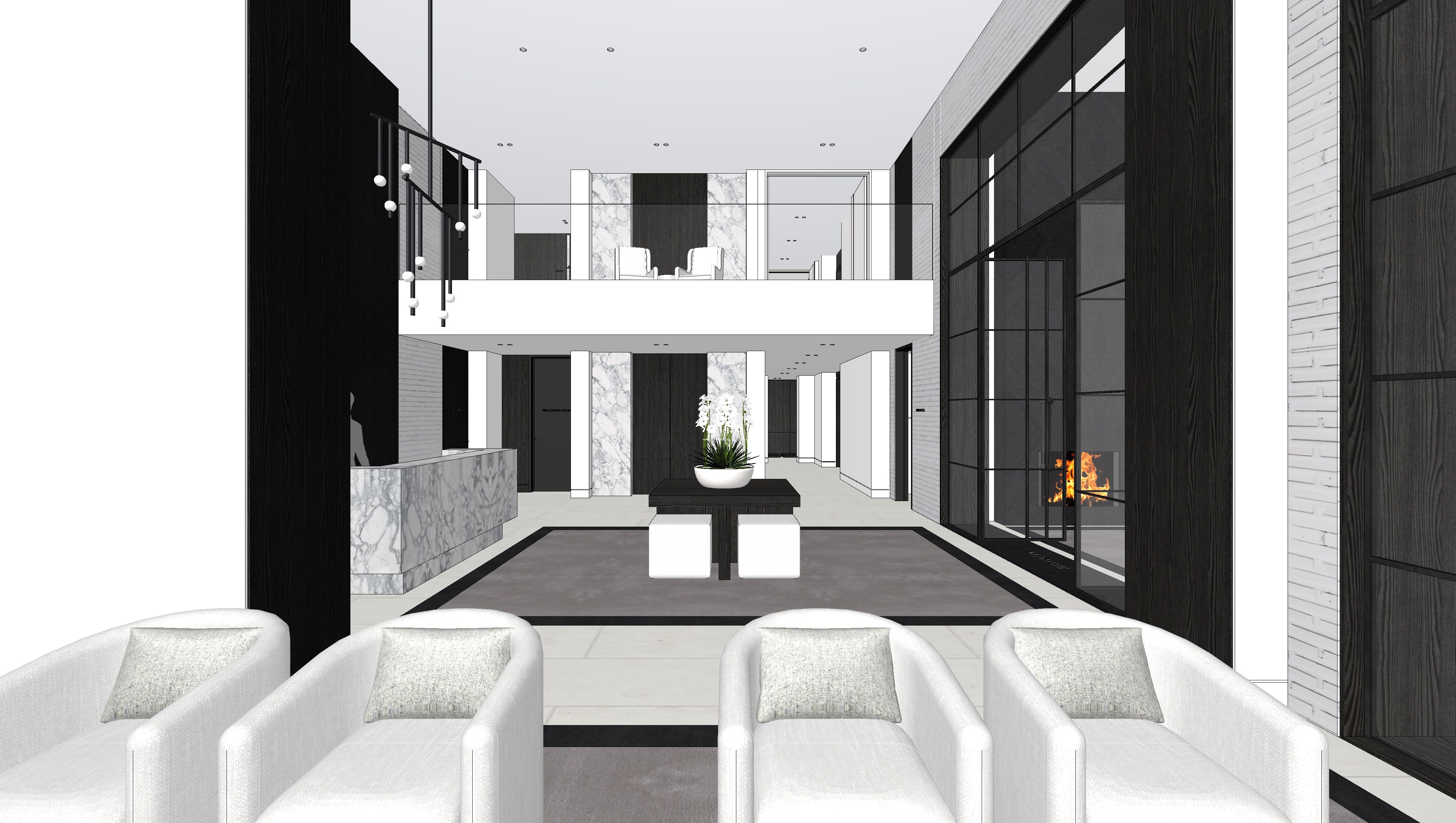 render a fully photorealistic nighttime version of this contemporary double height lobby maintain the exact architectural geometry proportions materials furniture placement ceiling heights window divisions fireplace location reception desk mezzanine and camera perspective do not alter layout scale or design only enhance lighting and realism scene overview a modern double height luxury lobby with a mezzanine level marble reception desk on the left black stained vertical wood panels white brick accent wall on the right large steel framed glass wall with fireplace and a central console table with orchid arrangement four sculptural white lounge chairs are positioned in the foreground lighting design nighttime atmosphere exterior condition it is fully night outside the glass wall exterior is dark with faint subtle reflections in the glazing the fireplace glows warmly and becomes a strong focal point interior lighting layers warm 2700k 3000k ceiling downlights recessed architectural downlights emit soft warm pools of light subtle beam spread with realistic falloff no overexposure or harsh hotspots mezzanine underside lighting soft concealed linear lighting integrated beneath the mezzanine edge gentle wash down the marble panels below feature wall vertical wood panels add concealed uplighting at the base of the dark wood panels to emphasize height and texture light should graze the grain subtly reception desk introduce a soft underglow at the base of the marble reception desk marble veining should catch light with subtle reflectivity fireplace flames should feel realistic warm and dynamic firelight should cast soft flickering reflections onto the adjacent glass and dark wood paneling subtle glow on nearby floor tiles central console table soft overhead accent light highlighting the orchid arrangement gentle shadow beneath the table foreground lounge chairs soft ambient illumination with subtle shadow gradients fabric texture clearly visible but not overlit materials realism marble satin finish with natural veining and slight reflectivity dark wood panels deep espresso tone visible vertical grain matte to low sheen finish white brick wall subtle texture soft grazing light steel window frames dark bronze or black metal with realistic reflections flooring large format light porcelain or limestone tile with soft reflection and shadow realism area rug soft woven texture with natural light absorption