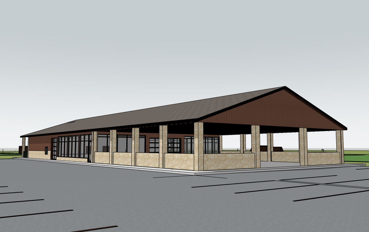 rendering building with batten board red siding adhered limestone base grey architectural asphalt roof