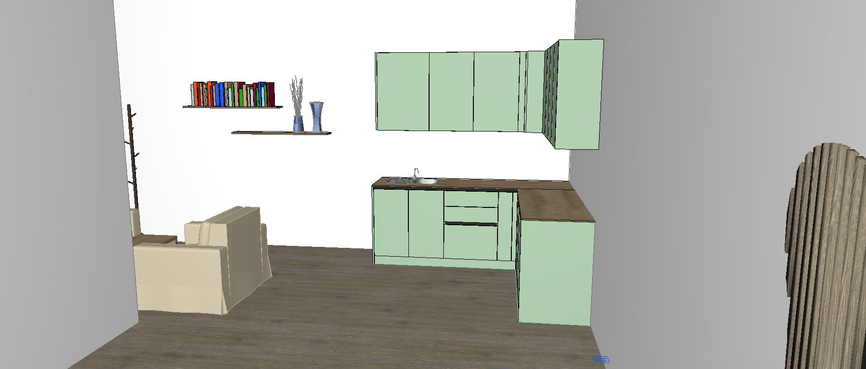 transform this archicad interior into a highly realistic photorealistic render while strictly preserving the original layout furniture design dimensions materials placement and all architectural details do not redesign do not add new elements and do not change the composition keep everything exactly as modeled only enhance realism this scene includes a compact kitchen and a small waiting area the kitchen cabinets should remain a light soft green color with a clean modern matte finish the worktop should remain in natural wood warm and realistic preserve the exact cabinet arrangement upper and lower units sink position and all original lines the small wai