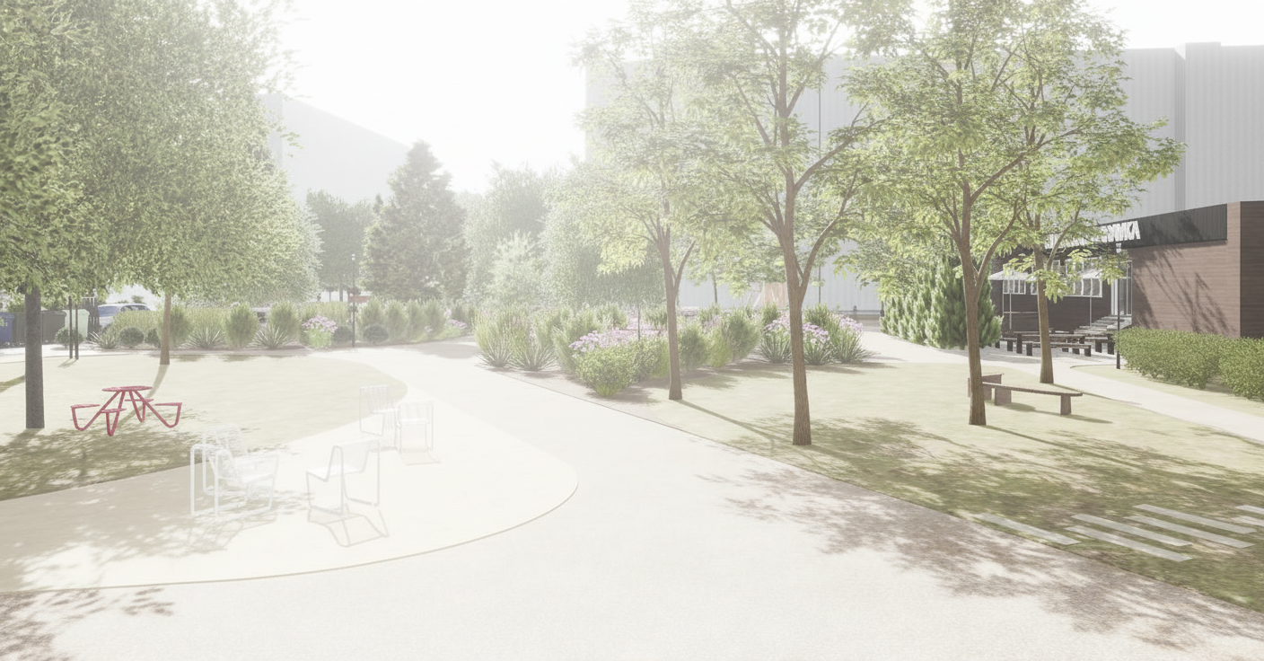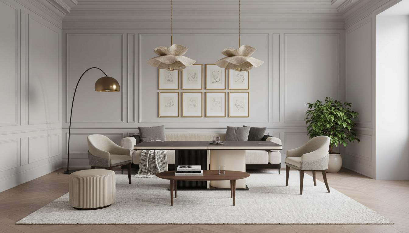 create a modern dining room with a cozy minimalist atmosphere include a creamy soft textured sofa with two tone gray and charcoal pillows add a soft white throw draped over the sofa arm position a large potted green plant in a neutral pot to the right of the sofa on the wall hang a grid of four framed art pieces with minimalist black and white sketches in black and gold frames use a gentle soft gray for the walls to enhance the serene atmosphere add floor stairs on the left side