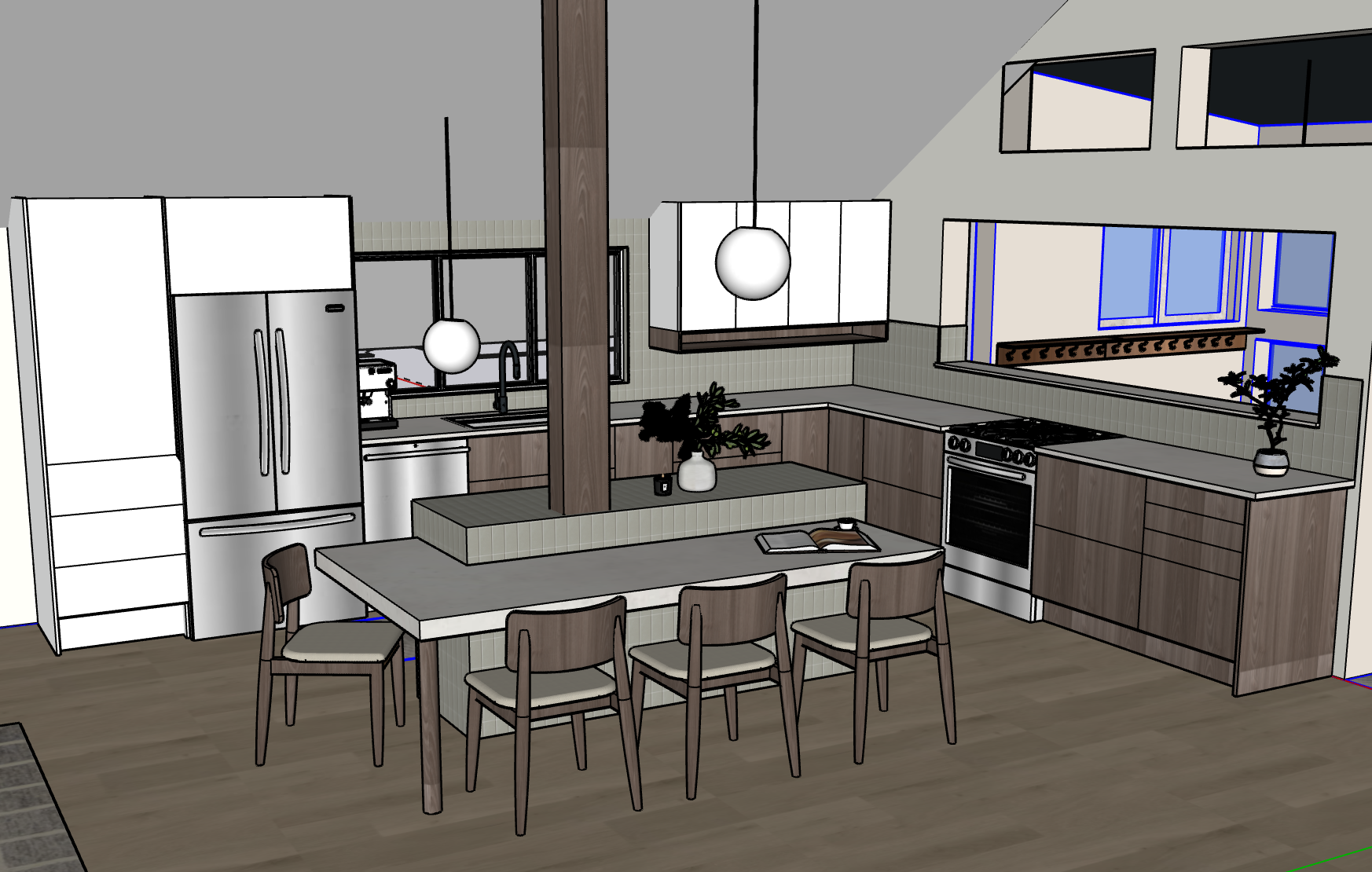 can you saturate the tile backsplash a bit more to a darker gray green and put tile on the island as the drawing shows ligthen the counters to a lighter white gray