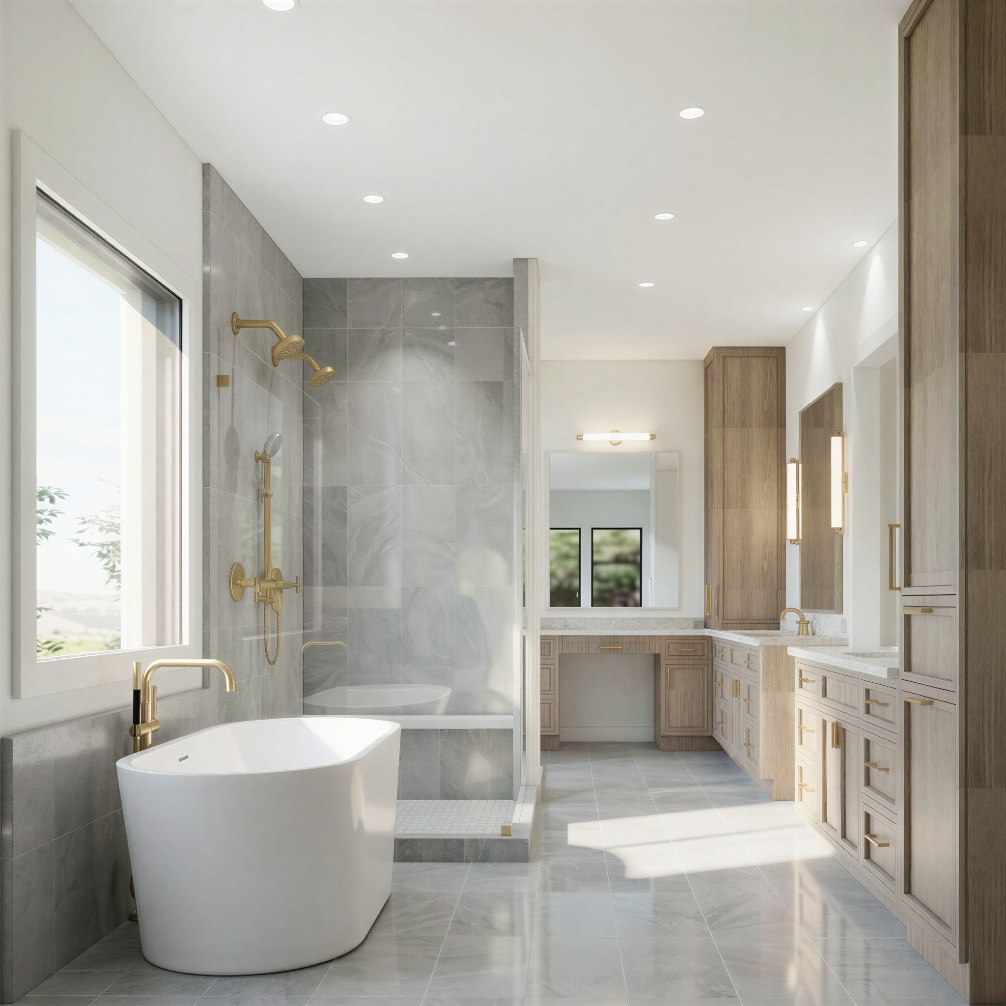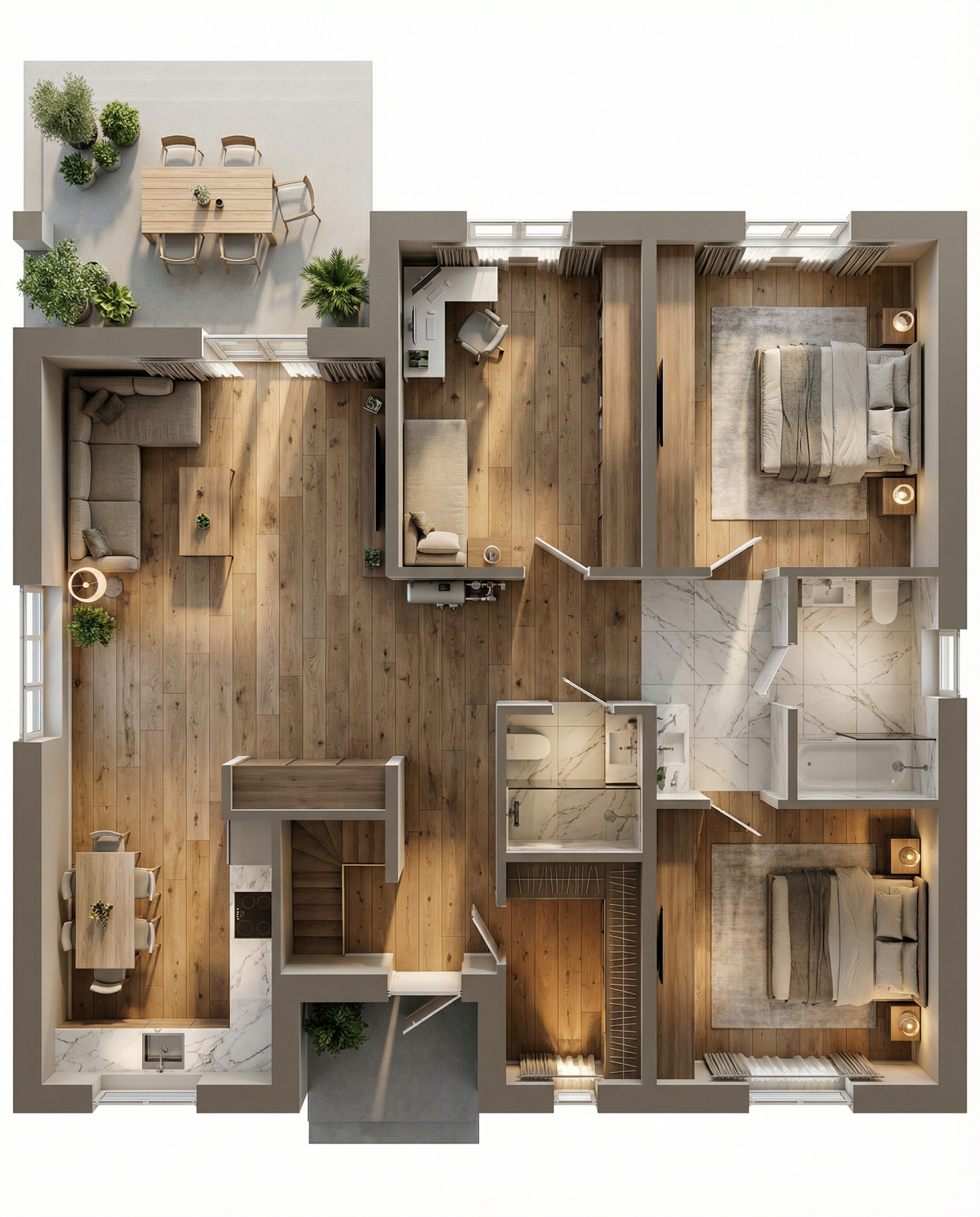convert this architectural rendering into a highly realistic editorial style luxury real estate photograph suitable for marketing and listing imagery maintain the exact architecture layout geometry window placement and proportions exactly as modeled do not redesign restyle or modify the architecture in any way do not move walls windows fireplaces cabinetry or structural elements enhance realism only through natural lighting accurate material texture subtle reflections and soft shadow depth the image should feel like a professionally photographed architectural digest style interior used for luxury real estate marketing materials in the space include builddirect engineered wide plank flooring in seashore finish walls and ceiling painted origami white by sherwin williams the marble flooring should show authentic grain subtle tonal variation and a natural matte sheen walls and ceilings in origami white should appear clean soft and naturally illuminated with balanced daylight and realistic depth natural light should be softly entering through the windows in an editorial photography style creating gentle highlights natural interior bounce light and subtle shadow depth similar to high end architectural photography the final image should appear highly realistic refined and editorial similar to a luxury architectural digest feature or professionally photographed high end listing do not alter architecture layout geometry or materials only enhance realism and staging add a realism prompt that emphasizes photo realistic image with soft natural light coming from the left side door here is the added realism section you can append to your prompt it keeps everything you already wrote but pushes the image toward photorealistic real estate photography with the light specifically coming from the left side door