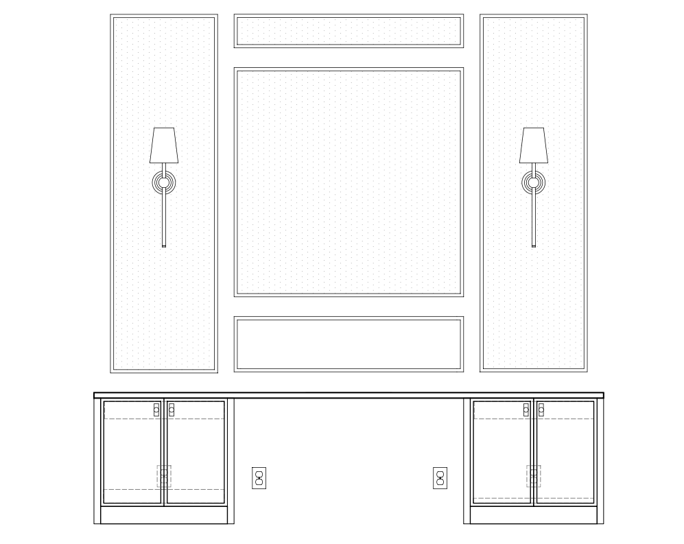 make a 3d rendering of this elevation the bottom millwork is sherwin williams shade grown the applied moulding is a 1 2 round profile in white wood top of millwork cabinet is wood