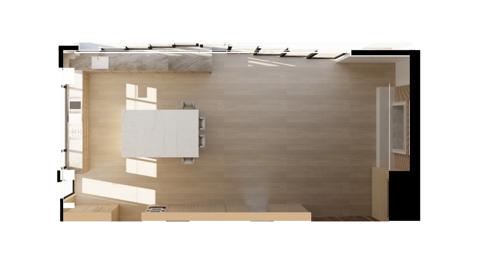 birds eye view of kitchen and living room across from kitchen island add sofa facing fireplace two chairs in front of the sliding door rug coffee table console behind sofa with 2 stools
