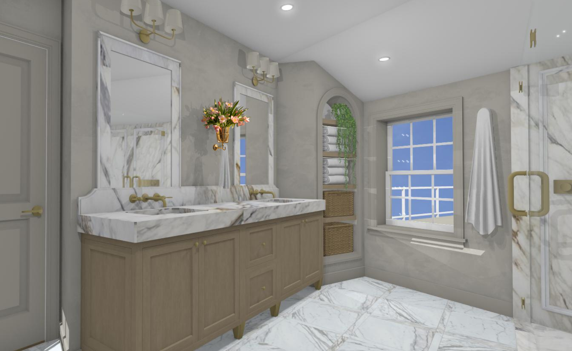 vanity cabinetry is a rift cut white oak finish with a light stain color all marble shown should be in a honed finish