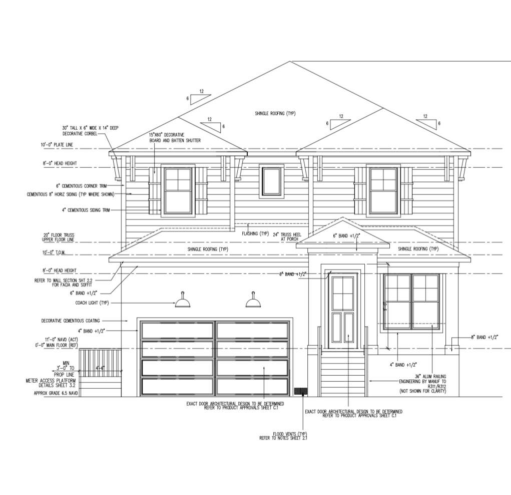 exterior shot render a beautifully detailed two story house with a coastal design the exterior has a white cementitious siding and dark gray shingle roofing add white trim for windows and doors the front porch features a door with a pale blue color the garage doors are coastal in style with windows at the top matching brass sconces above each the overall atmosphere is warm and welcoming set in a bright sunny afternoon with a clear blue sky and soft ambient shadows highlighting the architectural features remove all the words from the architectural plans