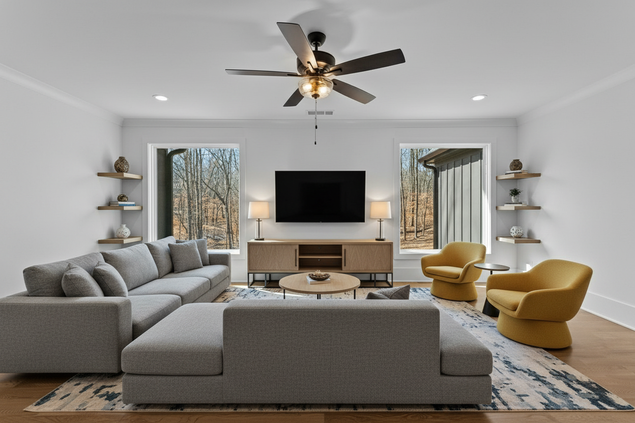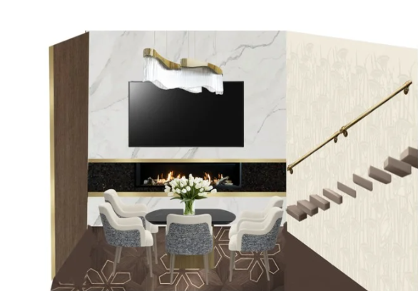 convert this floor plan into a realistic isometric 3d view of a full house show the space from an elevated angle with furniture walls and details visible photorealistic modern luxury dining area with a marble feature wall and linear fireplace wall mounted tv centered above round dining table with 6 upholstered neutral chairs and floral centerpiece sculptural gold and white chandelier with visible canopy and supports softly glowing left wall warm wood panel right staircase with patterned wall and gold handrail floor dark wood flooring with floral pattern metal inlay brushed brass subtle reflections lighting strong natural daylight from left warm fireplace glow soft chandelier light enhance realism detailed marble veining fabric textures metallic sheen clean high end composition ultra realistic use the same furniture as shows on the plan do not change the orientation of the floorplan