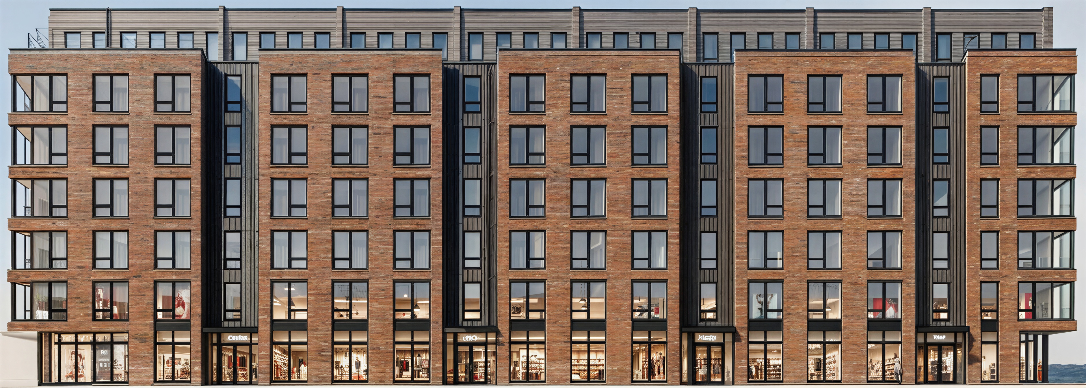 convert the rendered elevation to a photorealistic three dimensional rendering adjust the perspective and add an urban streetscape to the view
