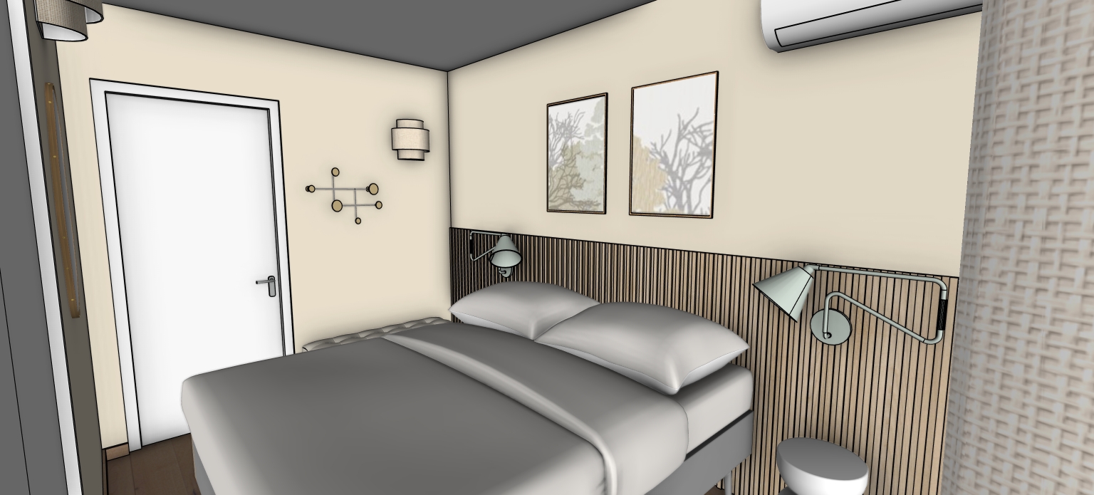 respecter integralement la geometrie et les couleurs du modele une lumiere douce naturelle rentre par la fenetre qui se situe droite les lampes de chevet sont allumees les murs sont couleur ivoire les appliques murales existantes sont en metal vert menthe la porte est pleine et blanche la lumiere naturelle rentre par devant la patere a des ronds en bois