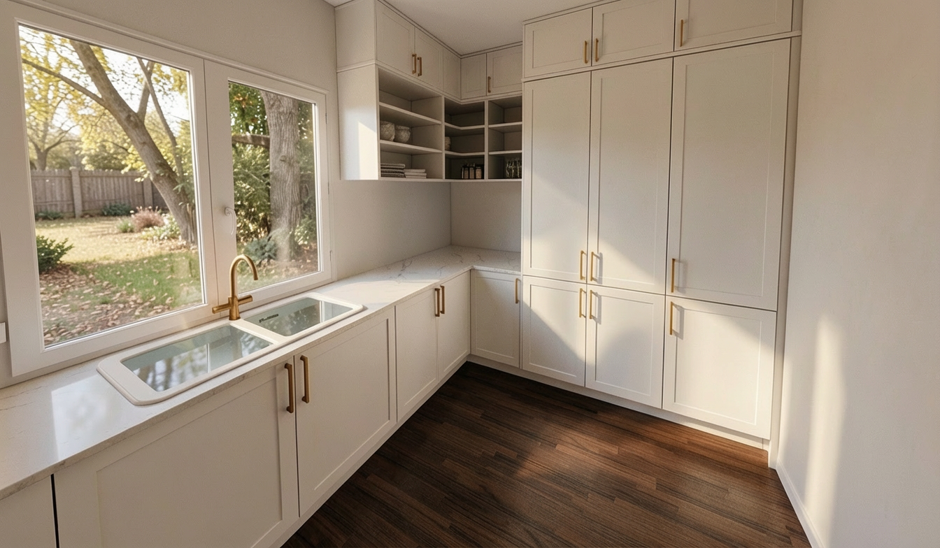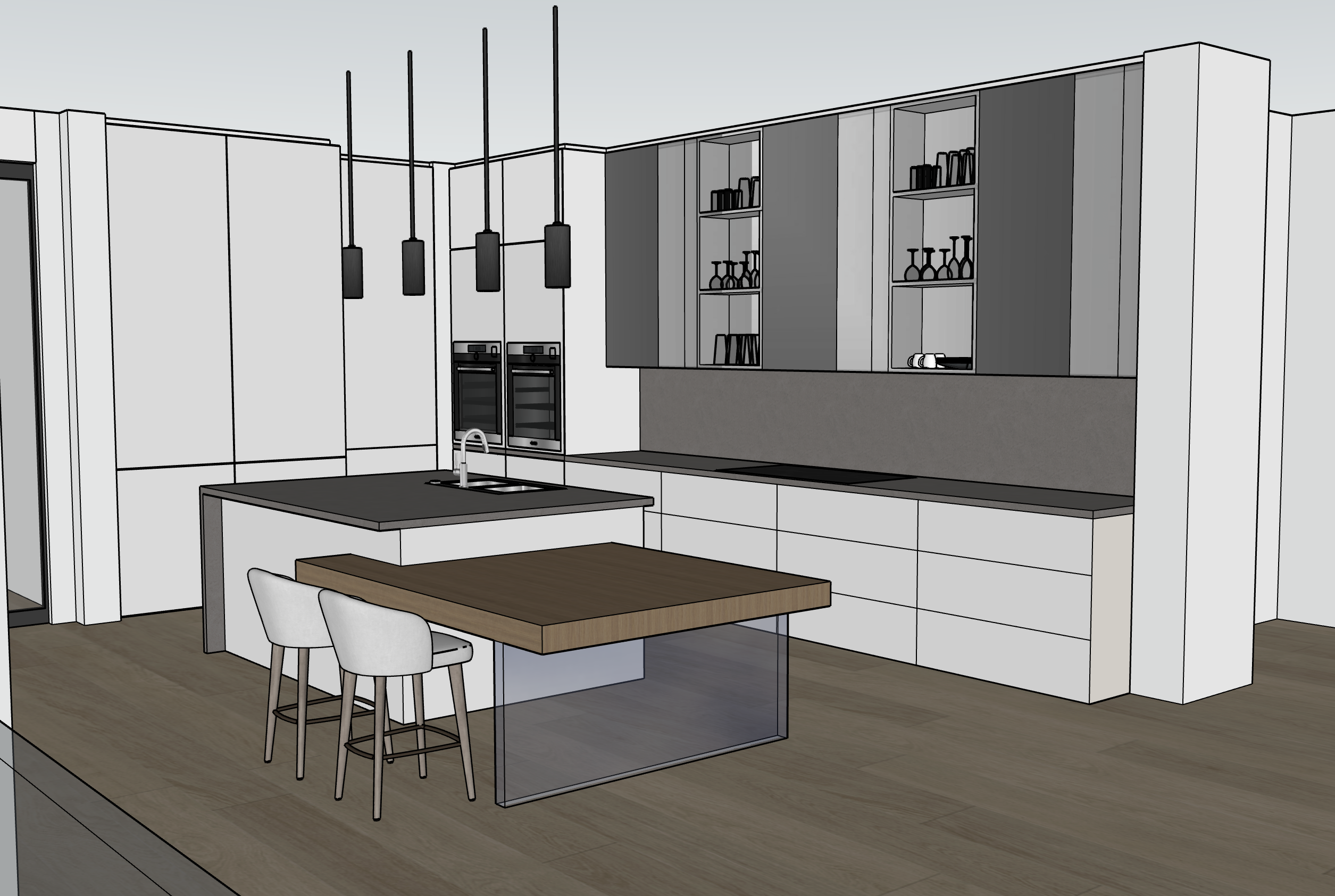 luxury contemporary kitchen glossy white cabinetry grey shiny countertop and backsplash and waterfall island edge medium light oak island extension with single glass leg white woven fabric modern chairs minimalist black pendant lights stainless steel faucet and sink back wall cabinetry above stove is glass in different shades