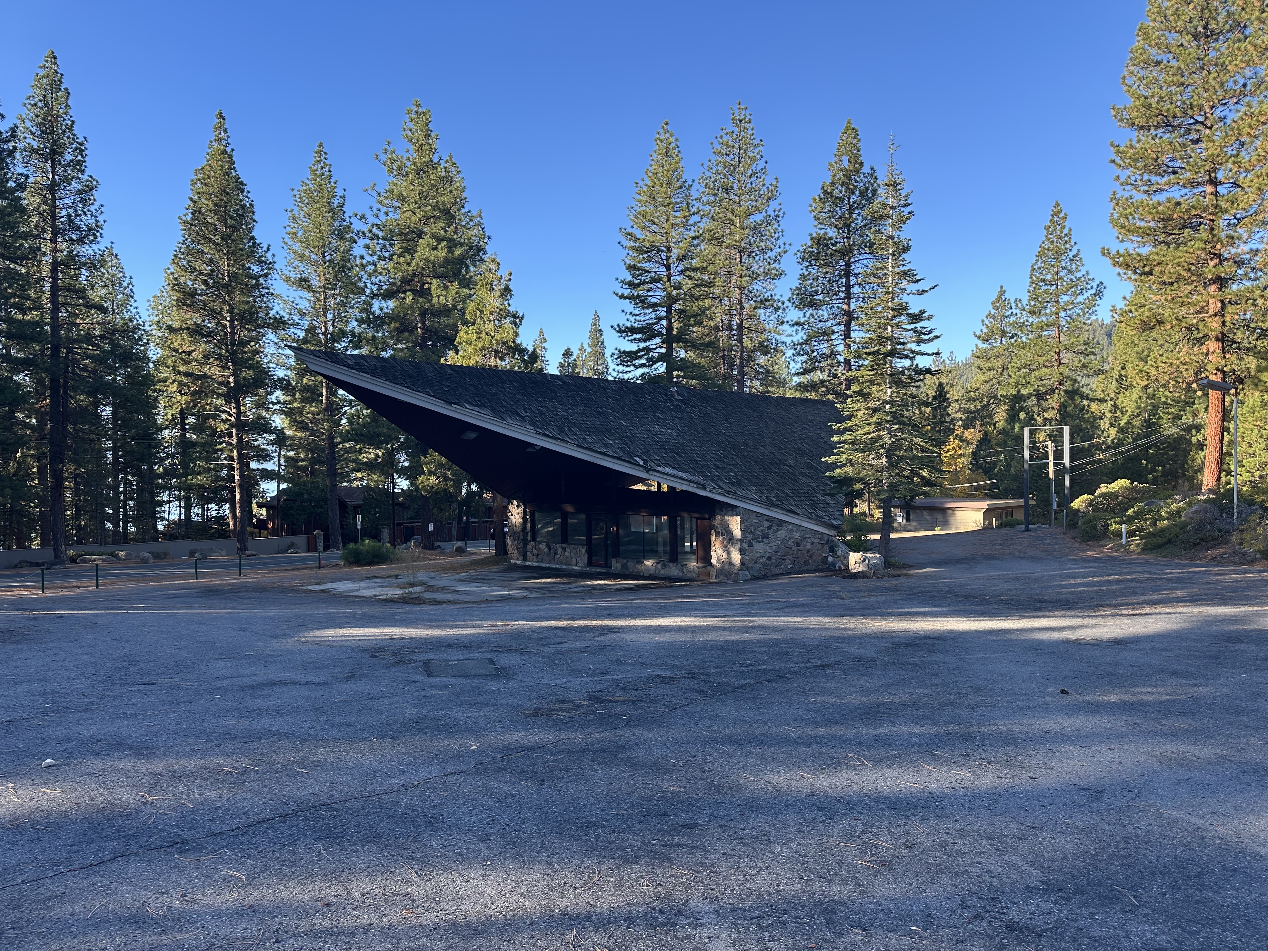 update the stone on the building to be ledgestone glass windows on top to roof keep structure the same add a park with grass as the background and foreground no glass under overhang dont modernize the roof architecture