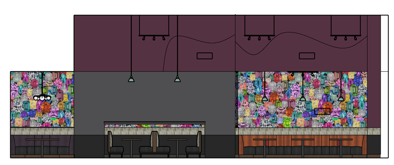 make this 2d elevation of booth seating look more realistic add shadows and mood lighting from the hanging light fixtures