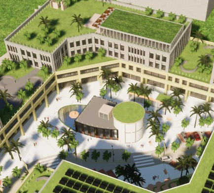 outdoor modern shoppping center pavilion surrounded by palm threes architecture