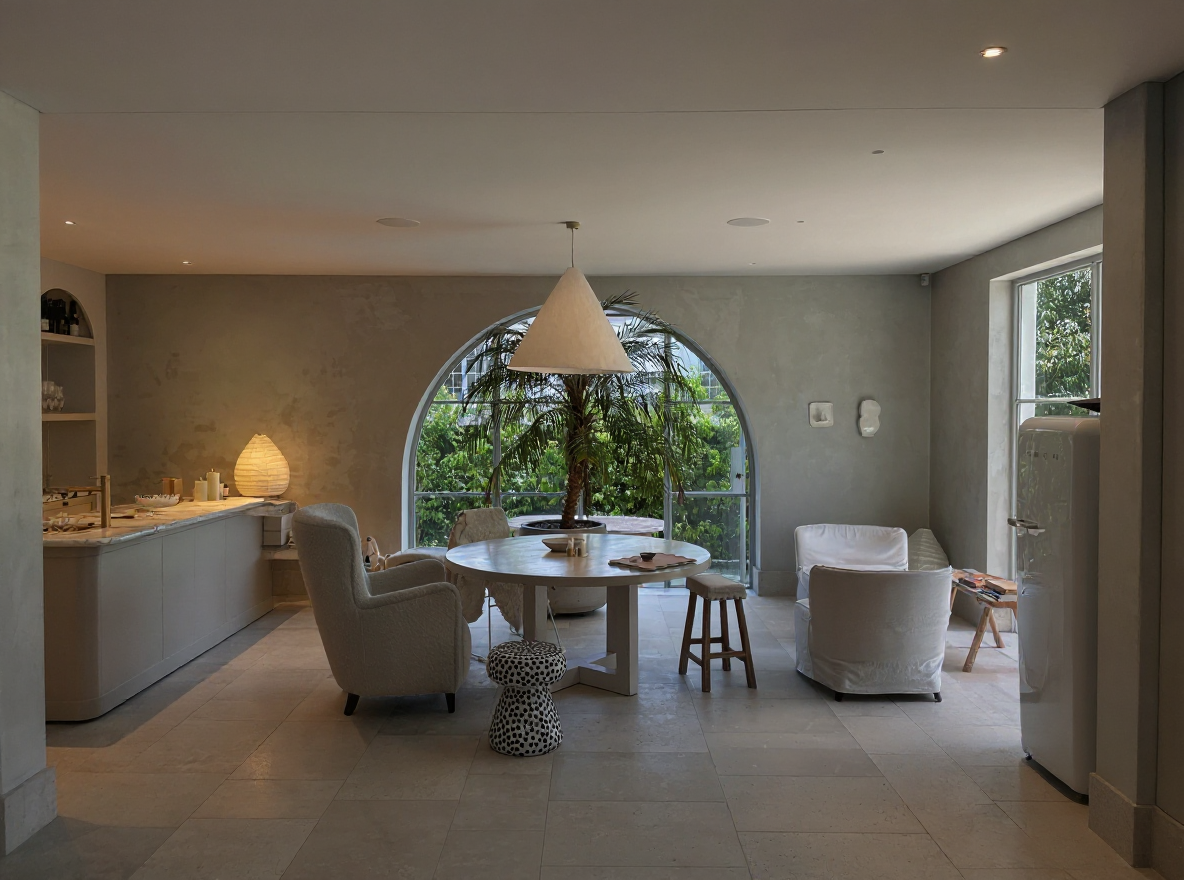 remove golf clubs the blue black bag on the right remove black timber framed furniture item in the foreground on the left remove the glossy white cabinet on the right that is behind the column and in front of the right glazing external light to be early dusk render with the all down lights pendant and lamp on