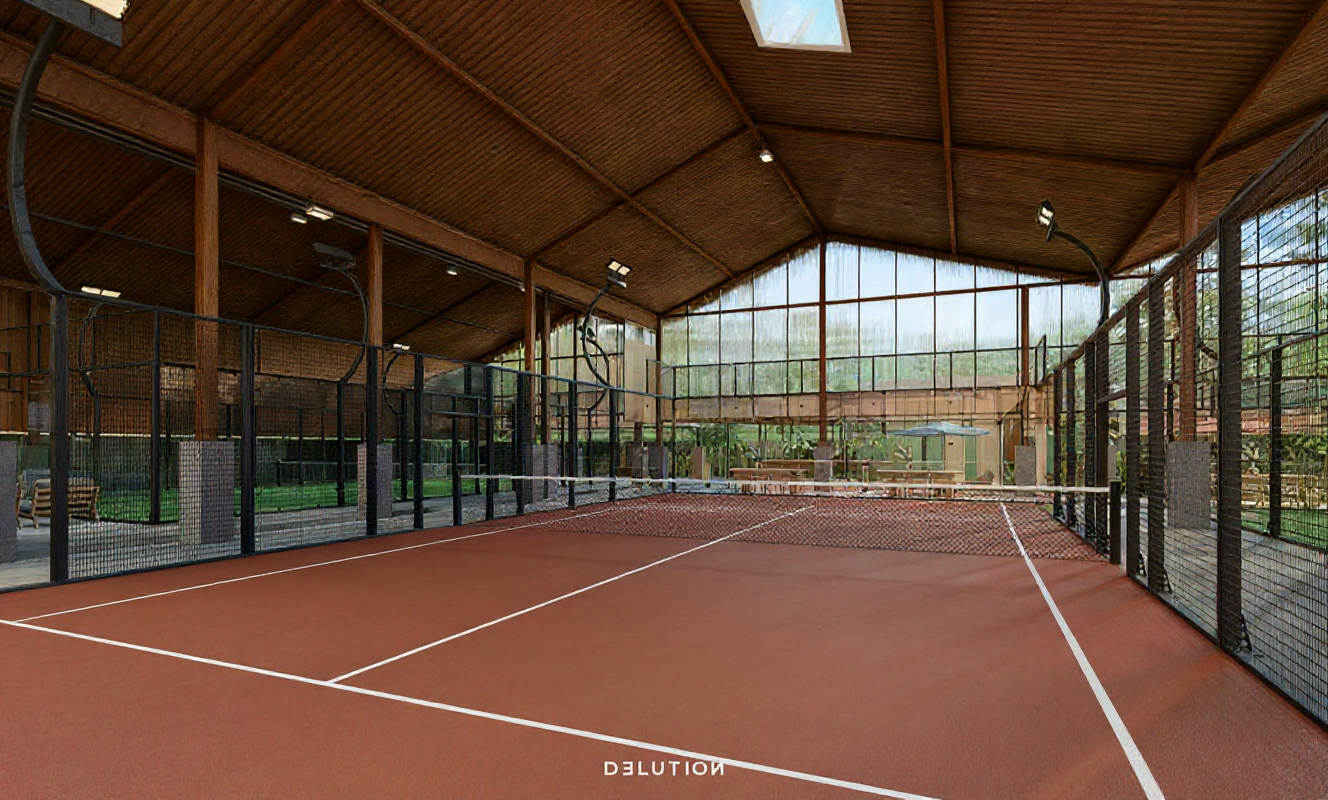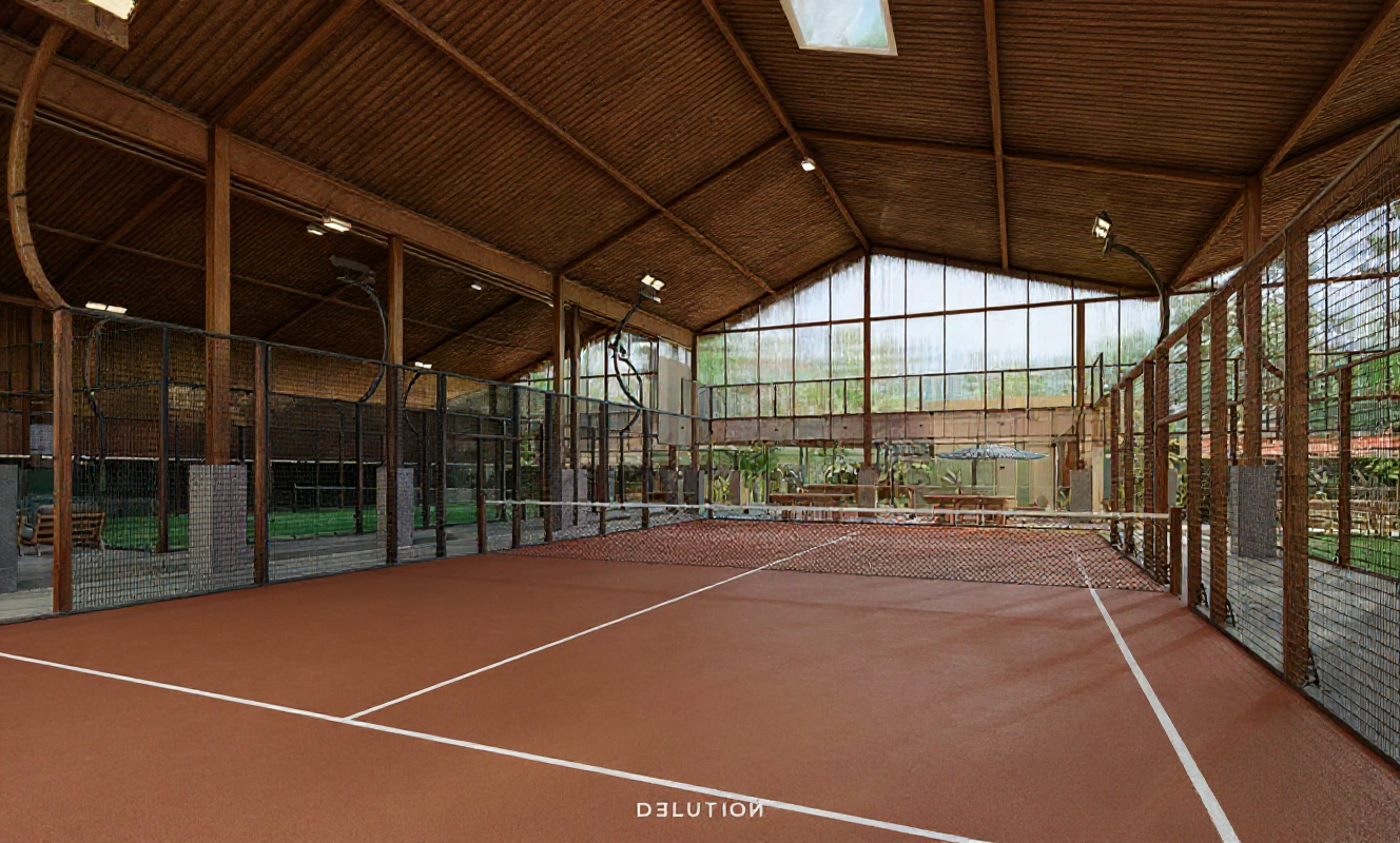 reimagine this padel court into a bali tropical material and colour palette floor change all the green padel court flooring into beige tone an exterior court border of grey stone all padel court lines to be maintained in white colour net change to a black ijuk rope fibre netting with wooden detailing structure change to wooden columns with grey stone pedestals roof change to timber planks panelling court lighting lamps change the curved black poles to curved bamboo poles lamp shade with palm fan shaped leaves as the lamp shades skylights mirror position of the ceiling window on both sides of the sloped roof with symmetrical placement the furniture outside the padel court to be changed to benches made of timber logs and sun umbrella with bamboo thatched covering ultra realistic 4k photograph