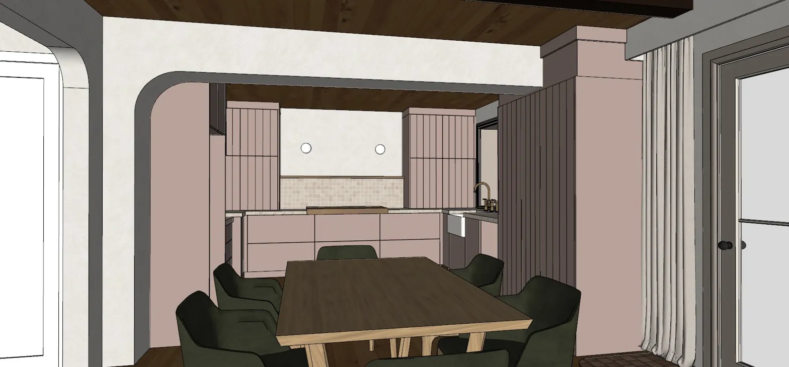 use the provided render as the base lock geometry lock camera lock all proportions layout and architectural elements do not move remove resize or reinterpret any element render exactly what is shown with photorealistic materials and lighting only preserve exactly as drawn arched opening on left wall exact shape and position honey colored wood ceiling with beam structure slat vertical column panels flanking the kitchen opening render in dusty rose pink matte lacquer exact position and scale all cabinetry fronts uppers lowers island dusty rose pink matte lacquer flat front no handles visible vertical slat wall panels right side dining table honey pine dining chairs deep taupe upholstery exact position and count linen curtains right side natural off white floor length keep as is farmhouse sink white apron front keep position brass gold faucet keep as is small mosaic tile backsplash and countertop warm sandy beige square format keep exact position between uppers and lowers two circular wall lights above kitchen keep position and round form medium brown wood floor throughout materials to render realistically cabinetry dusty rose pink ultra matte lacquer soft touch premium finish ceiling beams aged honey colored pine warm matte rustic but refined column panels same dusty rose lacquer as cabinetry slat detail crisp and precise walls warm textured plaster creamy white with very slight sand tone not pure white atmosphere swiss alpine home warm intimate crafted the kind of kitchen where the ceiling is low the light is golden and dinner smells incredible lighting warm ambient natural light soft daylight from right patio door warm tungsten glow from wall lights above kitchen gentle fill throughout no harsh shadows cozy golden lifted evening leaning warmth ultra photorealistic interior render swiss chalet residential kitchen warm editorial photography architectural realism strength 78 seed 1024