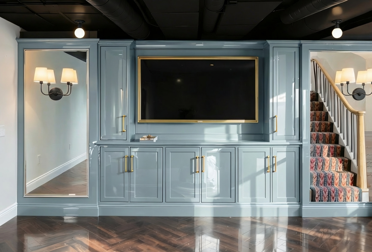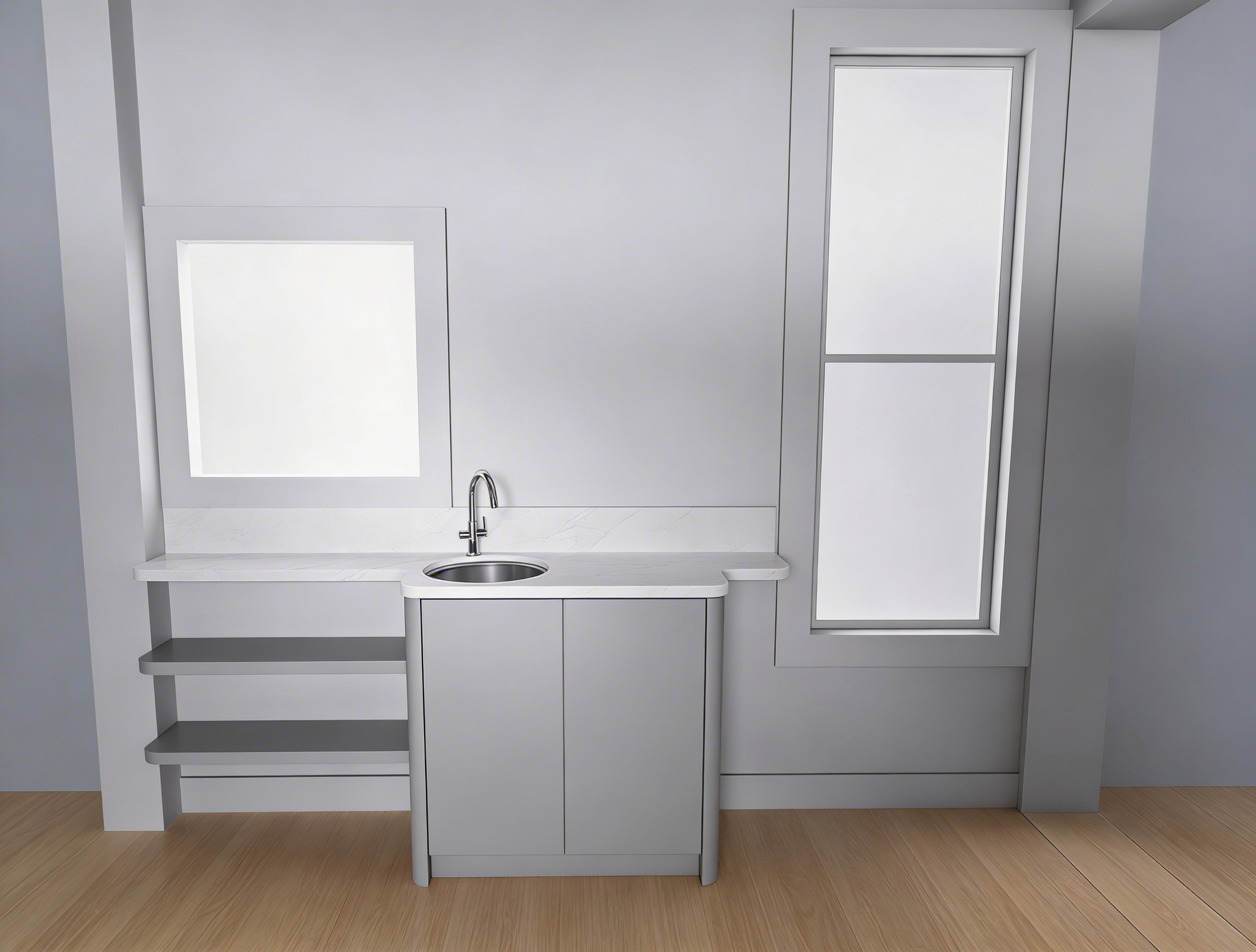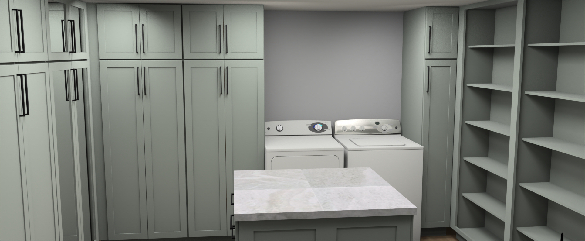 add shoes to the open shelving cabinet add hanging laundry rod over the washer and dryer