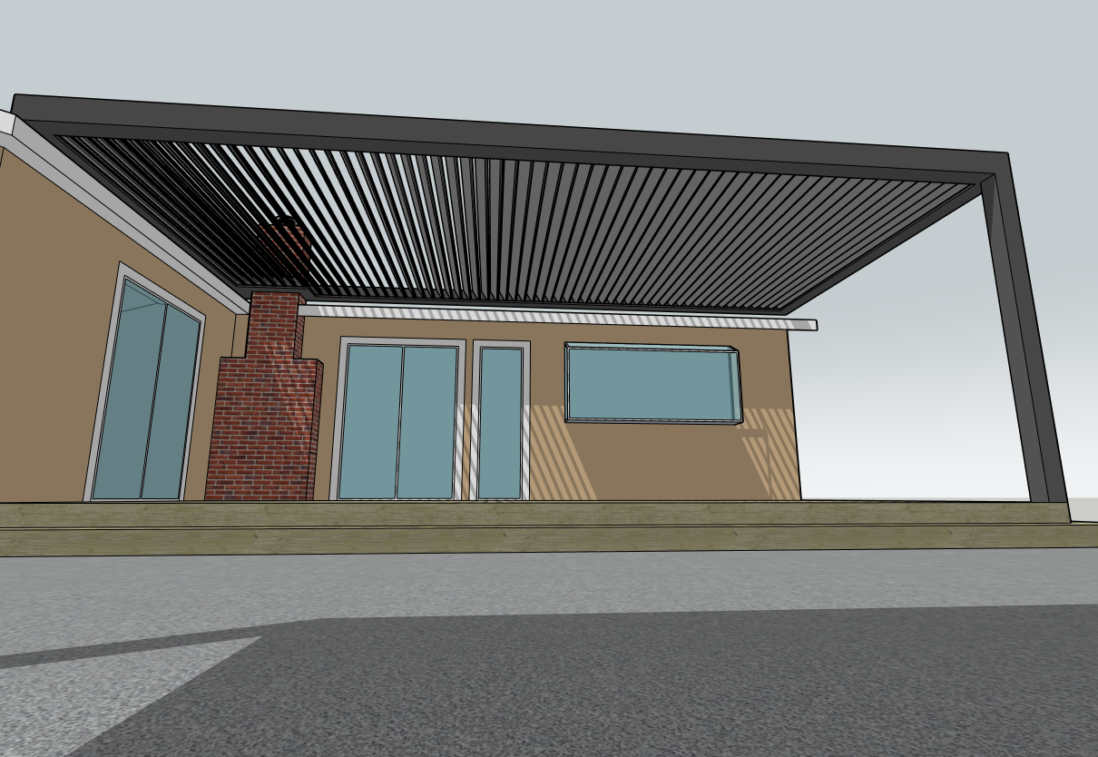 enhance this drawing make it more realistic make the patio cover a aluminum louvered roof with a dark frame