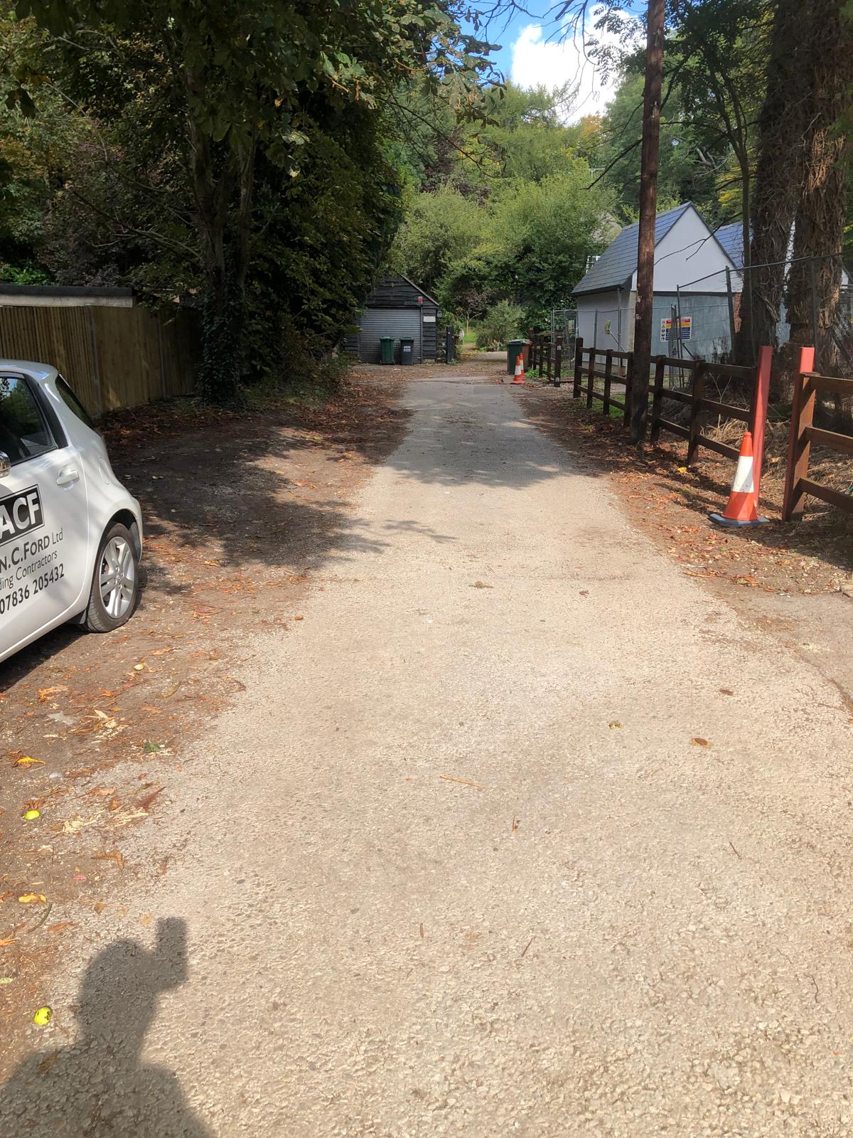 remove the car from this image make the paving all a cream resin bond type finish but with a cycle path and seperate adjacent footpath on the left hand side remove all bins from the image and add in planting to make it basically look like a private road with a single vehicular track on the right and then pedesrians walking and cycle path on the left with pretty wild flower planting in some places make is aspirational and remove the agareg in the background so the footpath and cycle path continue pass it but not the vehicular path