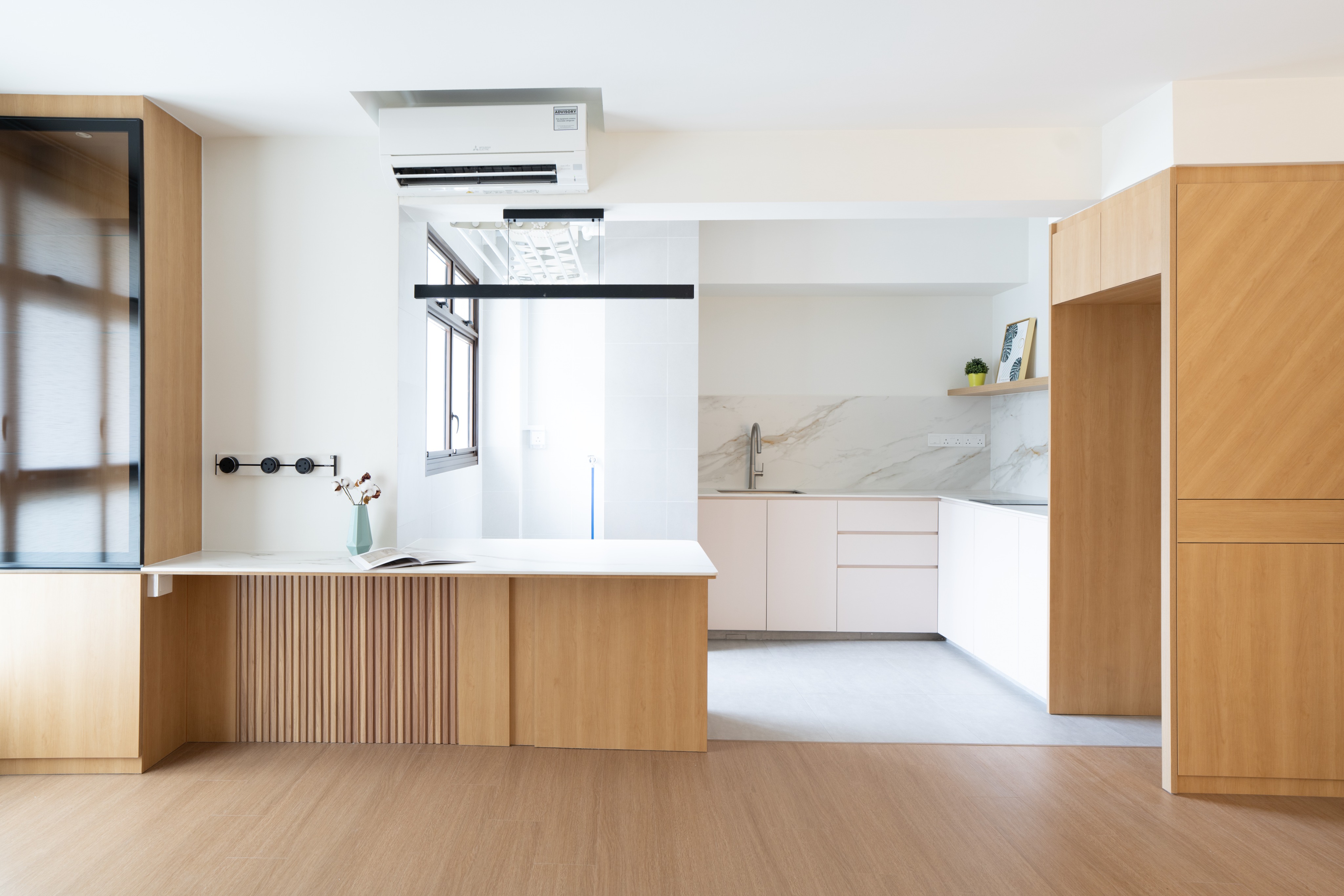 add some designer dining chairs to the island counter and kitchen accessories to decorate the kitchen also insert a fridge into the cabinets on the right of the image