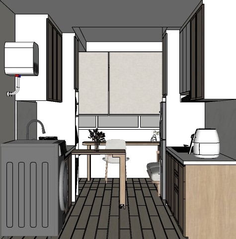 the rendering looks real and natural with a japandi style concept without changing the material shape and size of the image white ceiling light beige wall white window with beige roller blind white marble in top table and backplash kitchen cream wood vinyl floor wooden kitchen lower cupboard white kitchen upper cupboard with woven wooden doors