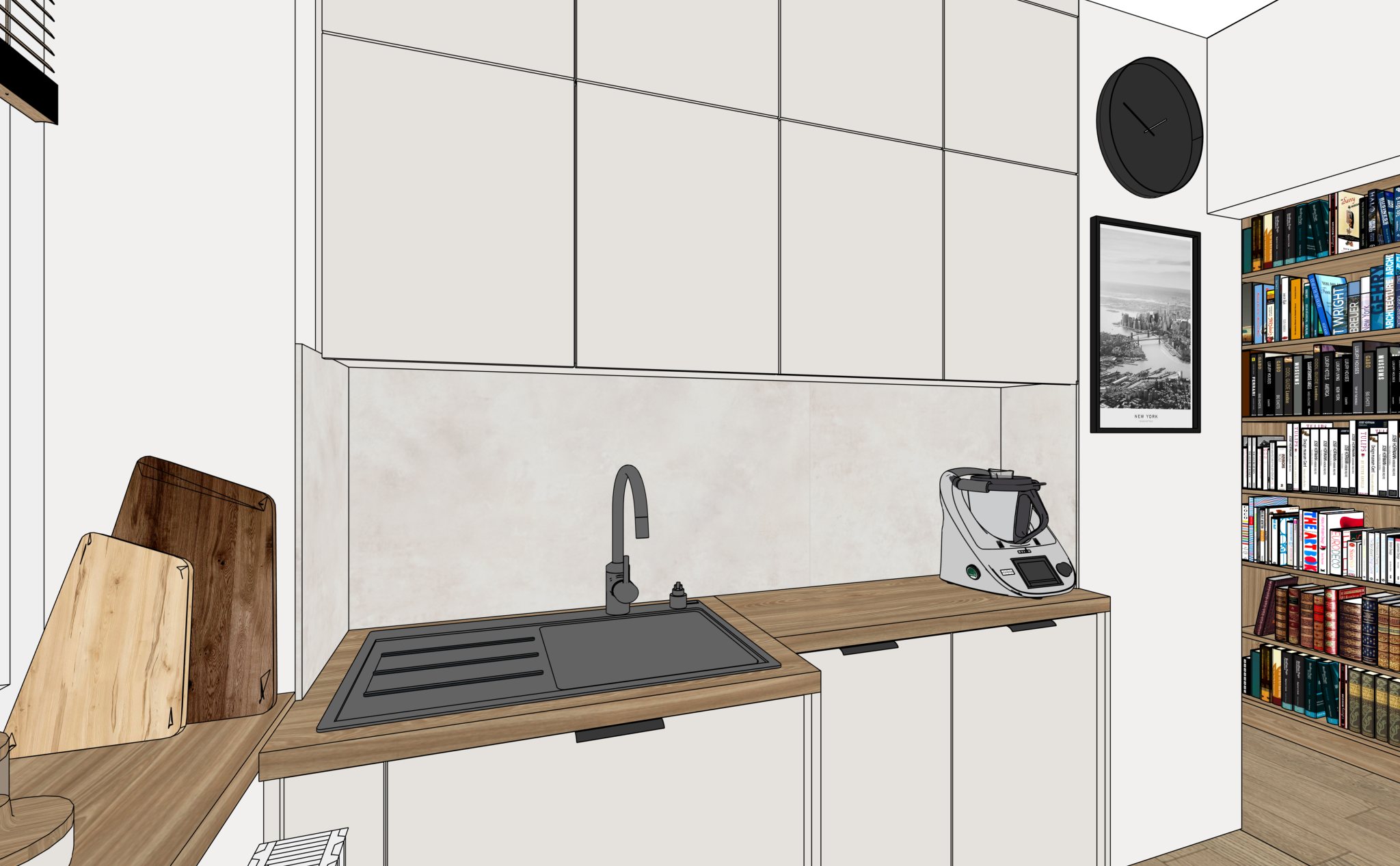 nie zmieniaj geometrii perspektywy kolor w tekstur mebli ani dodatk w nad blatami jest o wietlenie led za kamer znajduje si niewielkie okno zlewozmywak i bateria kuchenna s w kolorze grafitowej stali wizualizacja ma by hiperrealistyczna