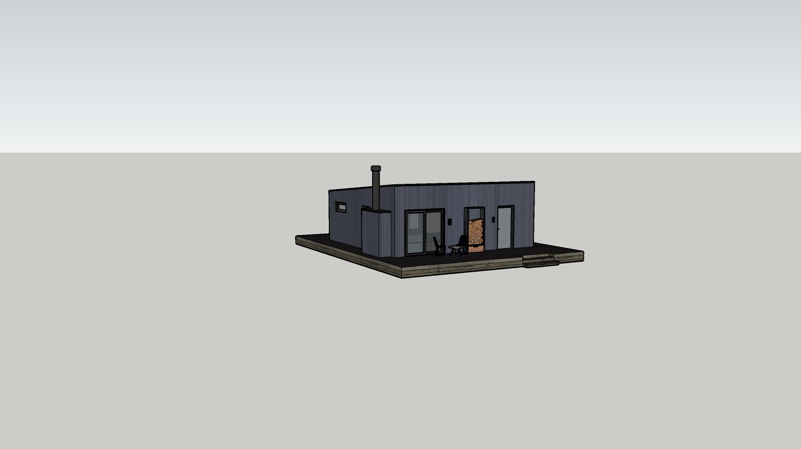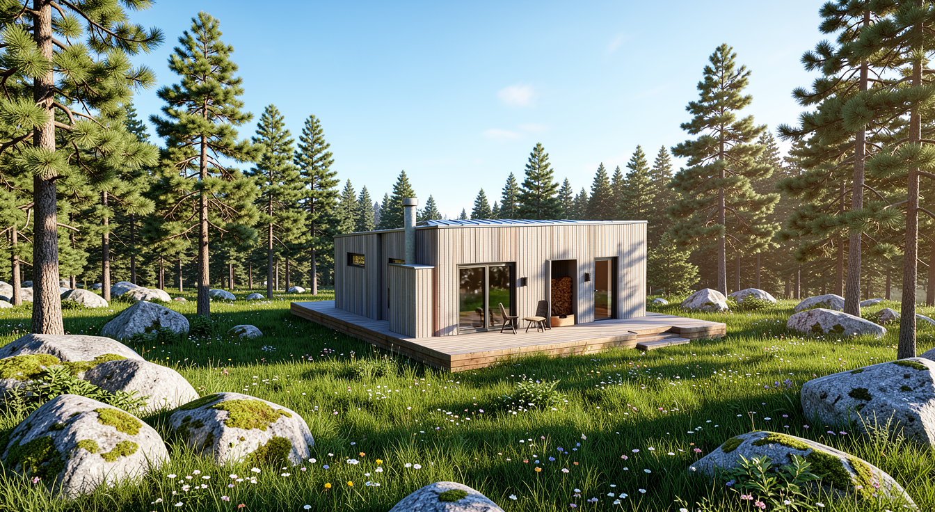 render a photorealistic 3d perspective of this house in a truckee ca reference the current material style metal roof verticle wood natural grey colour siding keep model geometry the same windows doors roof walls make a green meadow with moss gray big stones several pine trees around looks native to swedsih forest do not change the view only enhance the current materials and make the landscape nicer vegetation detailed textures in the wood siding and glass reflections and a vibrant clear sky with light atmospheric depth render in hyper realistic architectural visualization quality 8k resolution dont change geometry of house dont change point of wiev dont change roof geometry