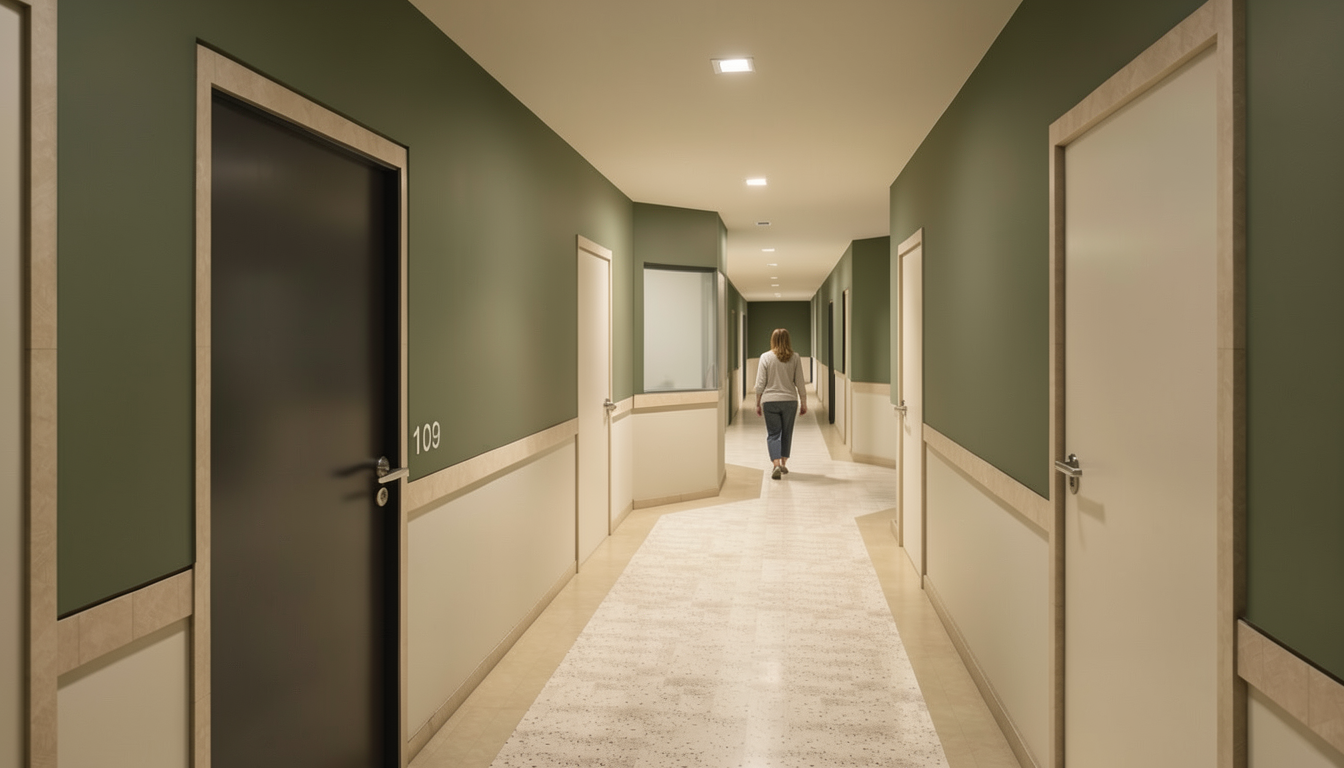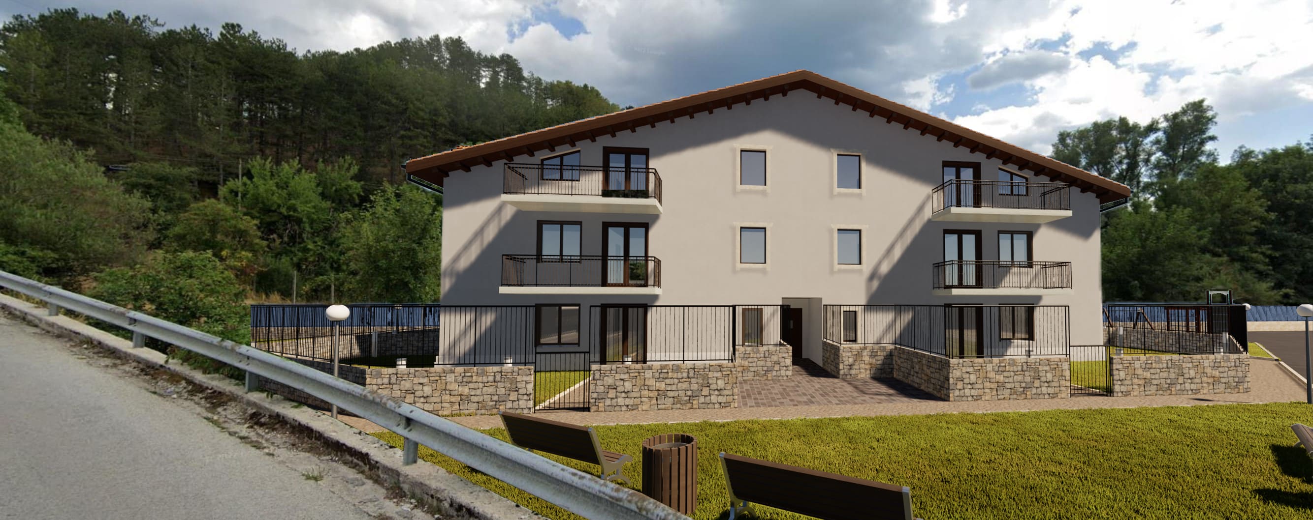 a charming countryside villa surrounded by lush greenery and dense forest the house features a cream colored facade with rich brown roof tiles black iron balconies and windows reflecting a serene sky the stone walls at the base complement the natural surroundings the foreground includes a well kept lawn with a wooden bench with a soft shadow adding depth the atmosphere is peaceful and inviting with a sky filled with soft white clouds