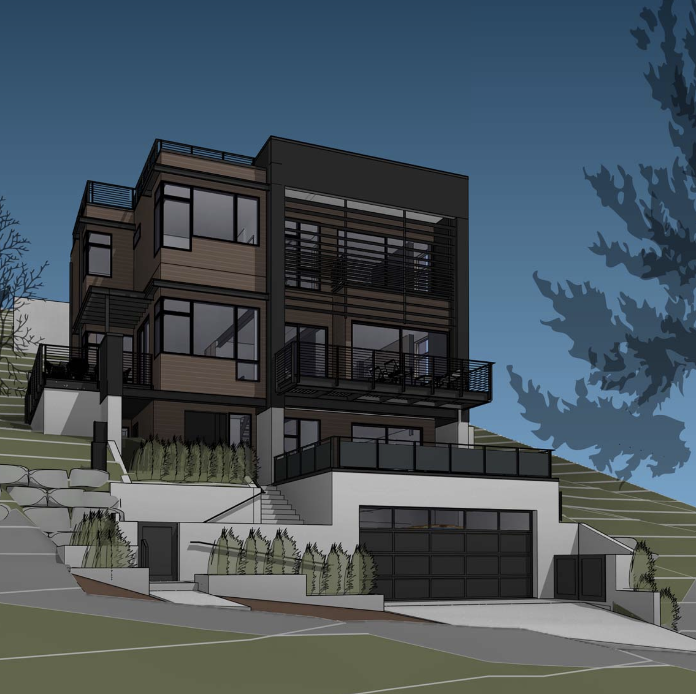add tall evergreen trees on the right side of the house with no view to additional landscape beyond change garage door to all glass add more foliage below evergreens to block any view of grass remove louvers from upper part of building structure no blue sky should be visible below the roof line on the right