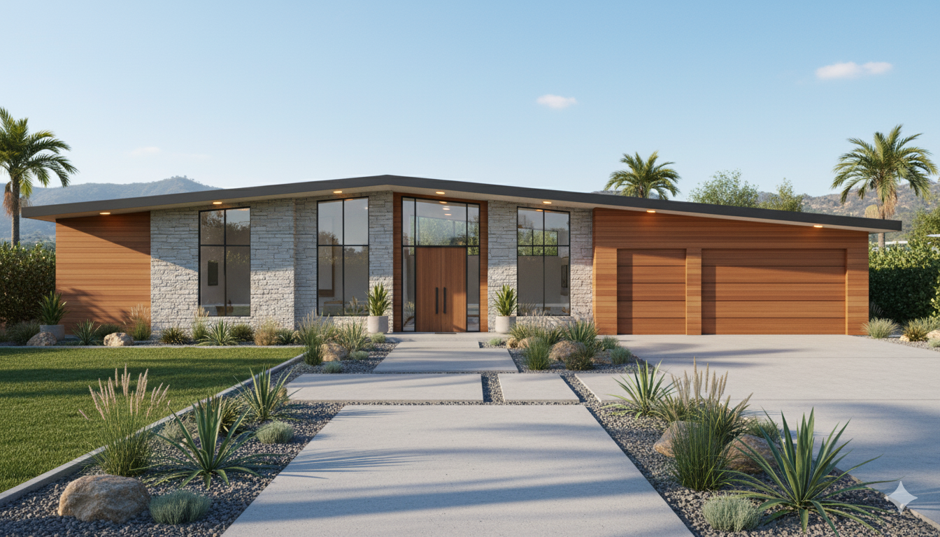 create a photorealistic rendering of a modern single story midcentury inspired home in daylight the design should feature a flat roof with strong horizontal lines dark exterior siding and natural wood accents show a wide garage door integrated into the fa ade with tall vertical windows framed in black highlight the contrast between the dark siding and warm wood tones include a clean concrete driveway leading to the garage and a modern planter box filled with bright yellow flowers near the entry surround the home with tall pine trees and natural green landscaping under a clear sky with soft daylight capture crisp details natural shadows and realistic reflections to emphasize the modern architecture in a serene forest setting architecture