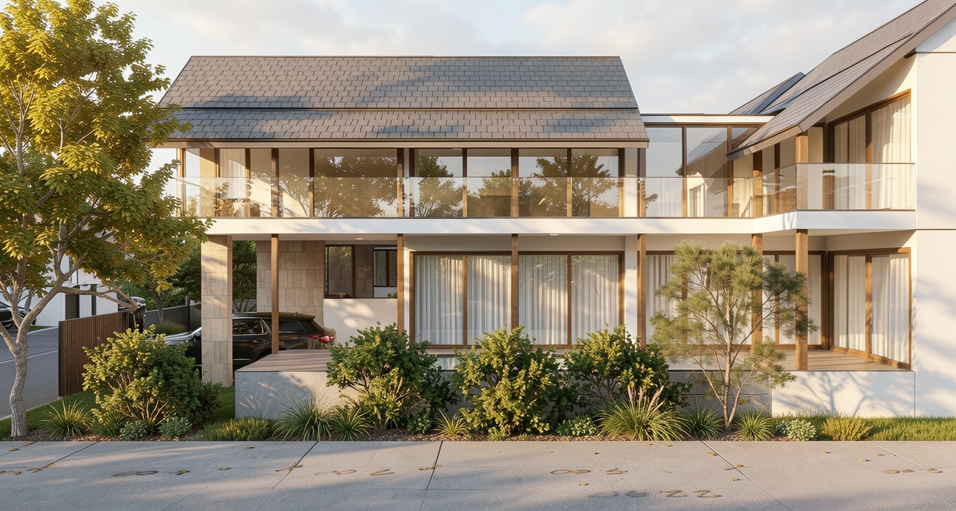 render senyata mungkin dengan panel warna krim polos bukan kayu dan dinding warna off white lantai vinyl krim dan panel di belakanag hapus jadi dinding polos pegangan tangga warna hitam ada lampu indirect di atas pegangan tangga dan lampu sorot kecil di pajangan plafon putih tempat pajangan bolong tembus tidak ada panel