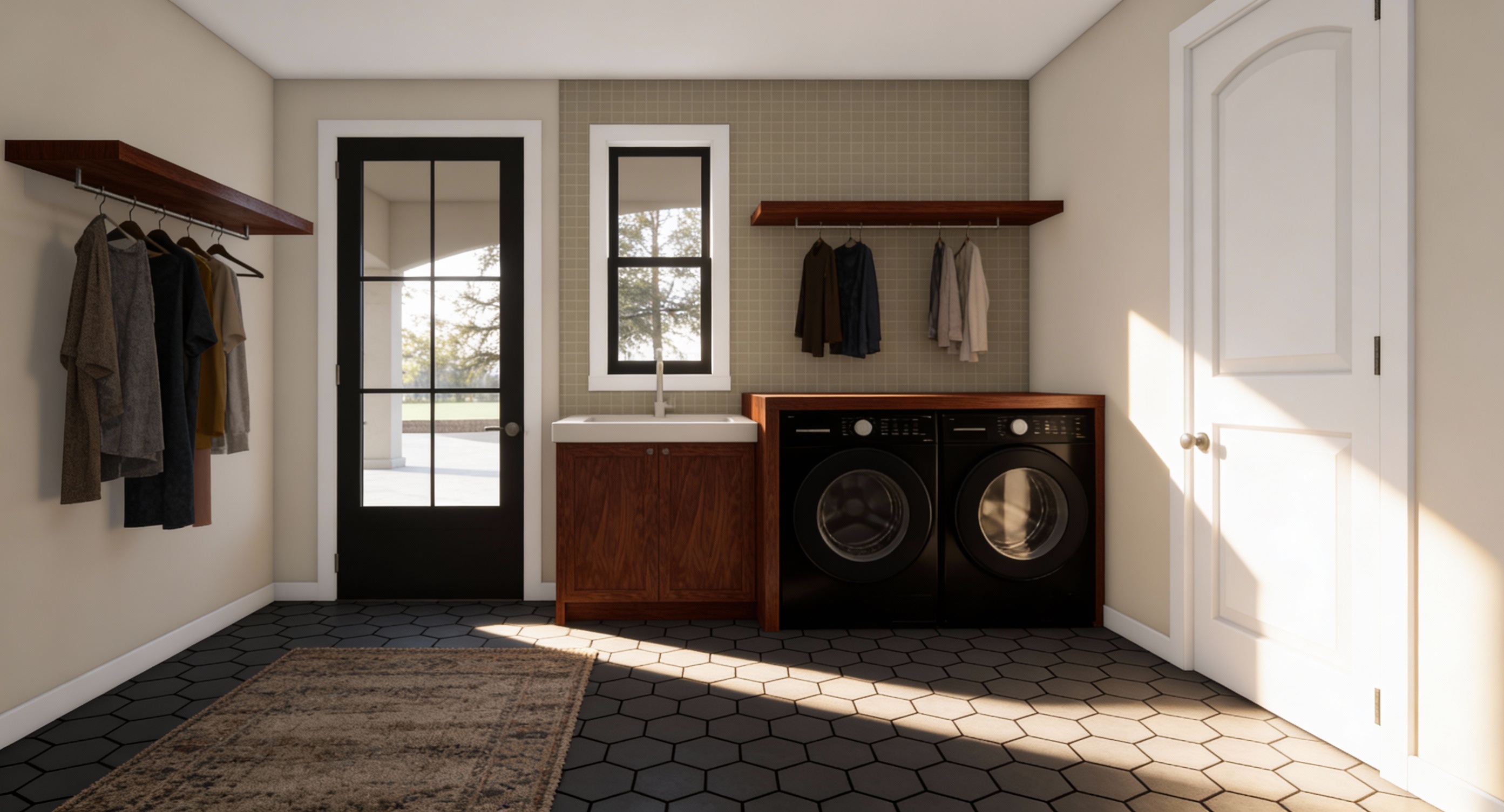 keep crazy stone feature wall for internal maintain colorbond kliplok fence in dark grey at the back all window frames are white balcony balustrades and awning above opentions are black dark grey do all rest of colour as image is