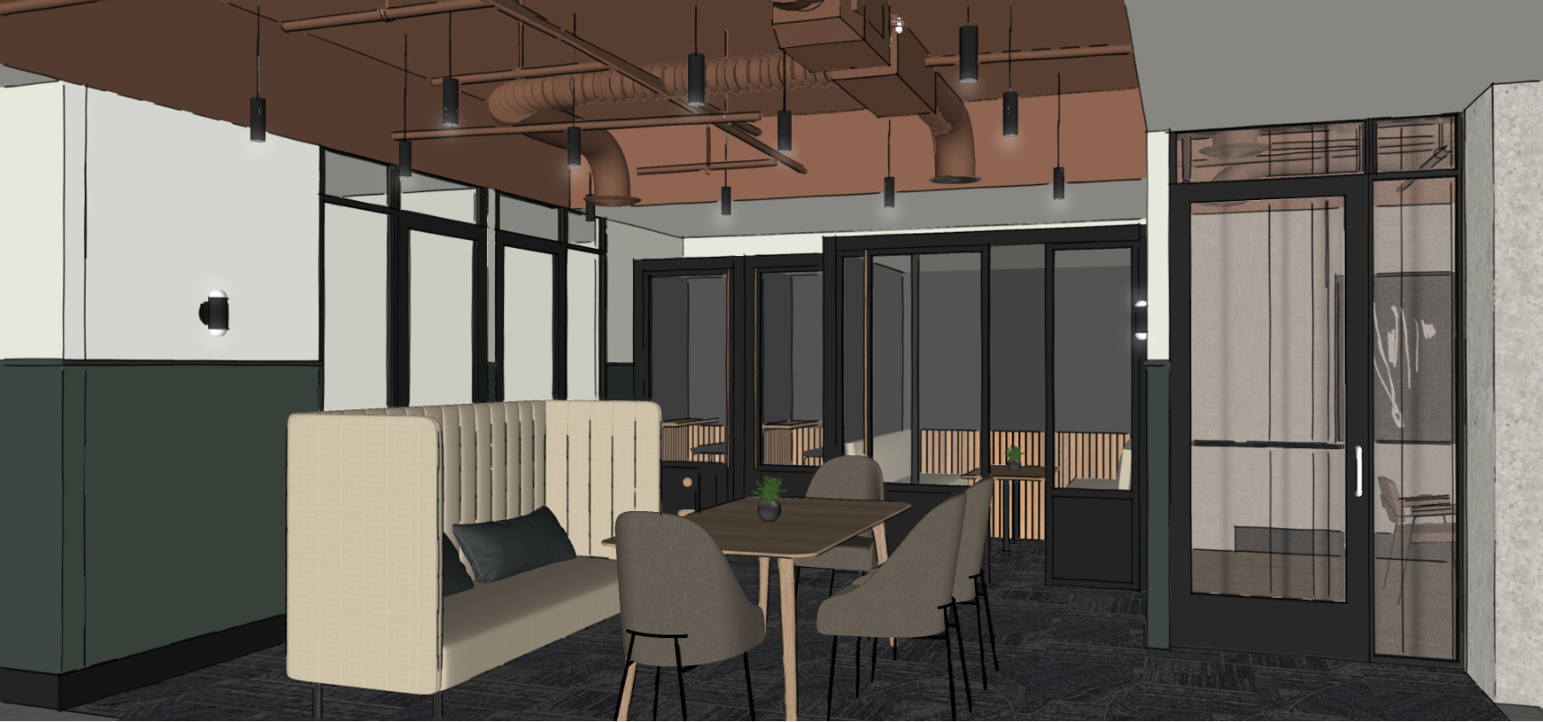this room does not have any windows to the poutside only glass parittions looking into adjacent conference rooms and meeting booths show this room at night