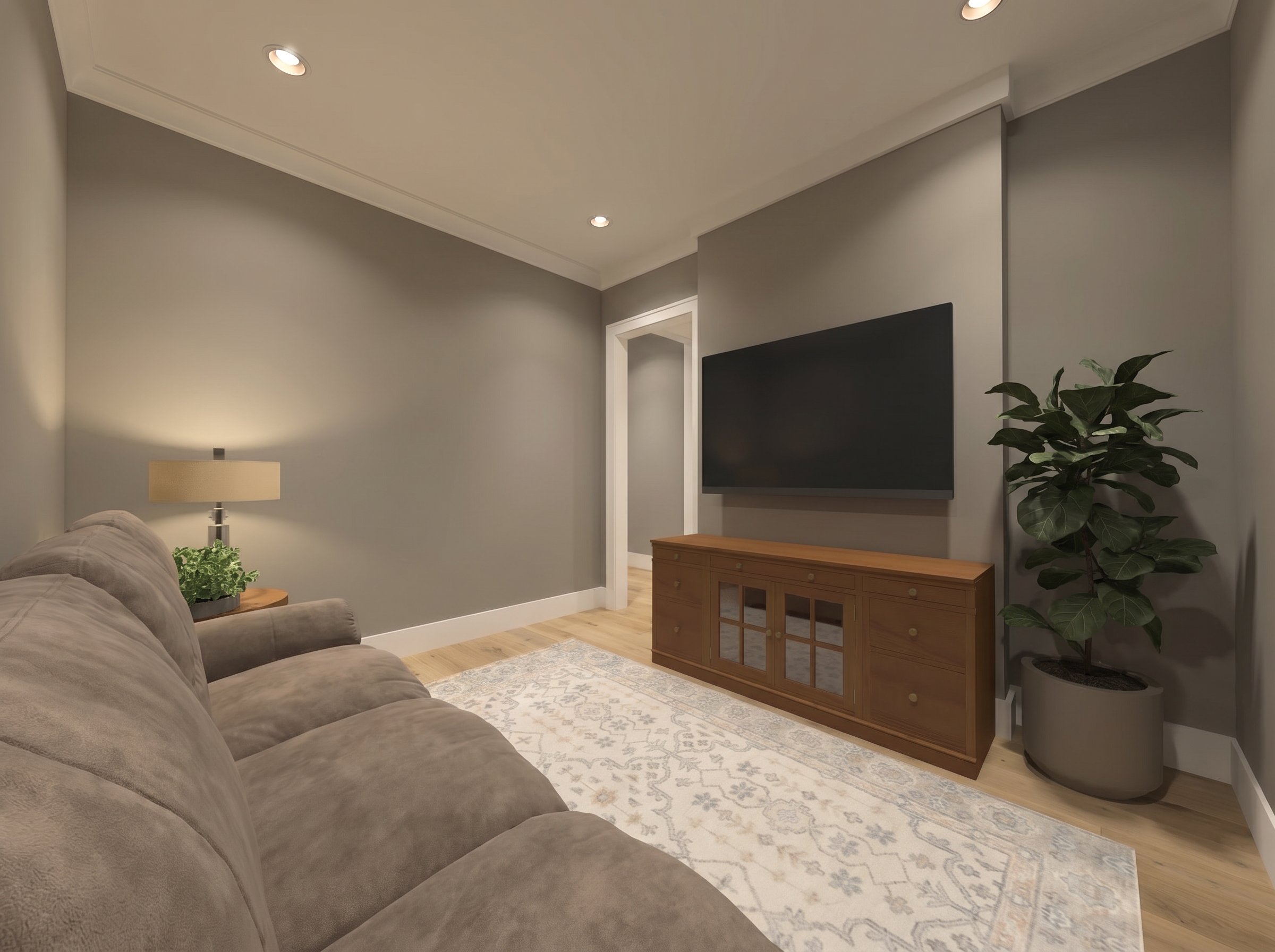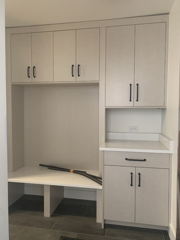 do not change the cabinets in any way preserve the exact cabinet colors materials finishes dimensions door and drawer styles hardware spacing alignment and all geometry exactly as shown do not alter the countertop shape backsplash appliances flooring lighting fixtures or wall structure only remove the construction materials clutter and mess from the scene clean the room and make it look finished and staged add a few simple tasteful home accessories appropriate for the style of the space but do not add or remove any furniture windows or architectural elements maintain the original lighting direction and realism enhance clarity and polish the photo while keeping the cabinetry and room design completely unchanged do not alter the lighting to keep the cabinet colors as they are in the image remove the black pipes restage for a modern mudroom with shoes in the open cubbies below the bench hang coats on hooks do not change the cabinetry at all
