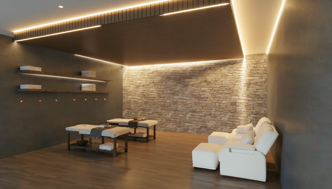 change the herring bone flooring to an off white multi loop level carpet brighten up the white tiles up to 30 create a matte finish for the wood with a lighter tone up to 60 help me change rug to blue colours uplight the white tiles that are in matte finishes from the strip floor lighting create backlit lighting for the word amara the end of the corridor is a tinted glass door this is a confined space no sunlight in the render