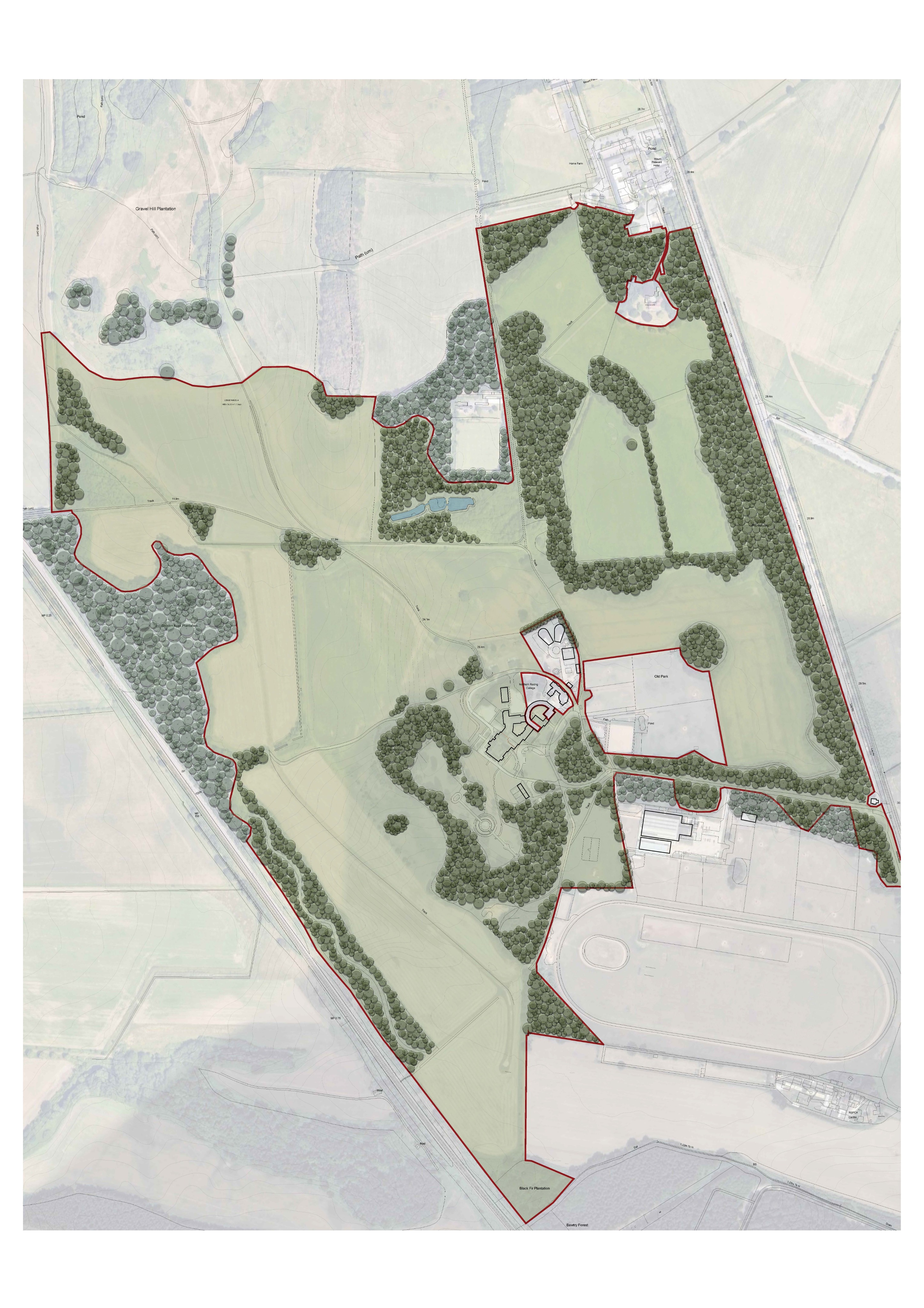 imagine a picturesque aerial landscape rendered beautifully with soothing colors vast fields stretch out in vibrant shades of green divided by winding deep green tree lines that create natural boundaries the fields are outlined with a delicate red border adding contrast and definition in the center structures and paths appear in soft natural shades of beige and gray blending harmoniously with the environment the atmosphere is calm and serene evoking a feeling of tranquility and openness as if the land is bathed in gentle early morning sunlight