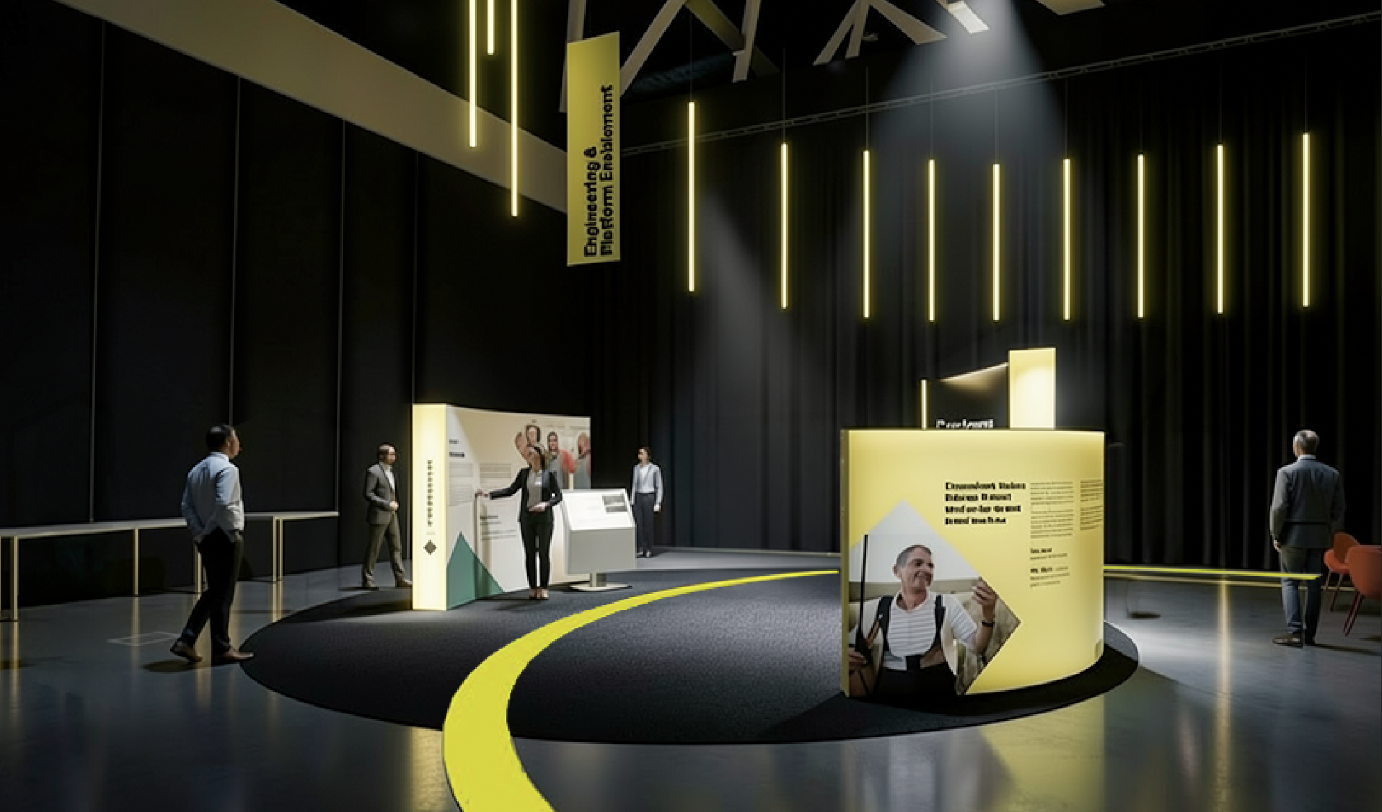 create a sophisticated exhibition space set in a dimly lit environment the atmosphere should be modern and sleek utilizing a dominant black backdrop to accentuate elements include a circular carpet on the floor in a dark grey tone with bright yellow curved line on the floor that guide the viewer s eye the ceiling is illuminated by glowing vertical yellow neon lights a subtle spotlight enhances details creating a balanced and immersive atmosphere
