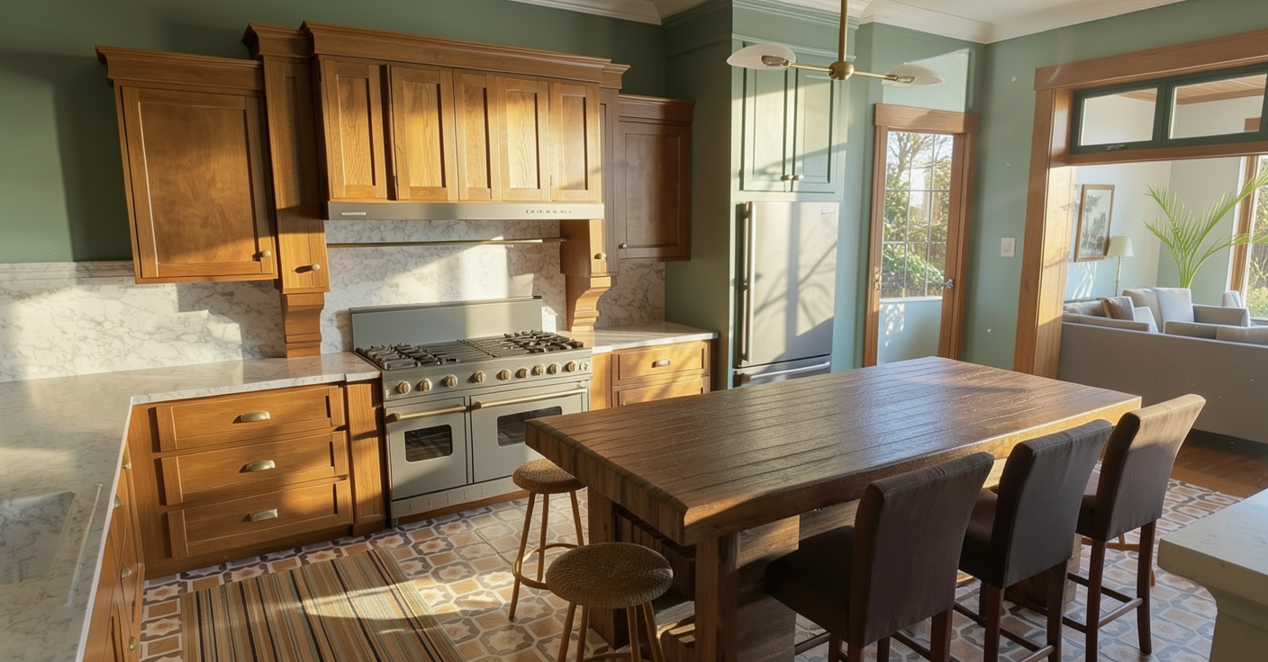 modern premium kitchen interior minimalist warm aesthetic scandinavian influence biophilic design natural wood flooring wood doors in background large window with natural daylight exposed dark chocolate wooden ceiling beams warm indirect lighting soft ambient lighting cozy atmosphere central kitchen island as main focal point large modern island with stone quartz countertop waterfall edges natural veining premium finish integrated sink and minimalist faucet in island bar stools with natural wood and upholstered seats main kitchen area with modern flat panel cabinetry handleless design matte finish in warm neutral tones soft beige warm greige light taupe built in appliances clean modern lines seamless integration walls with modern decorative moldings contemporary wall panel moldings elegant wall trims vertical and geometric paneling modern classic style light neutral color palette warm white beige soft greige floating shelves with decor plants books warm accent lighting biophilic elements indoor plants natural textures organic materials premium residential interior architectural interior design modern luxury kitchen calming atmosphere ultra realistic render cinematic lighting soft shadows realistic reflections high detail photorealistic wide angle interior shot interior architecture visualization professional 3d render quality