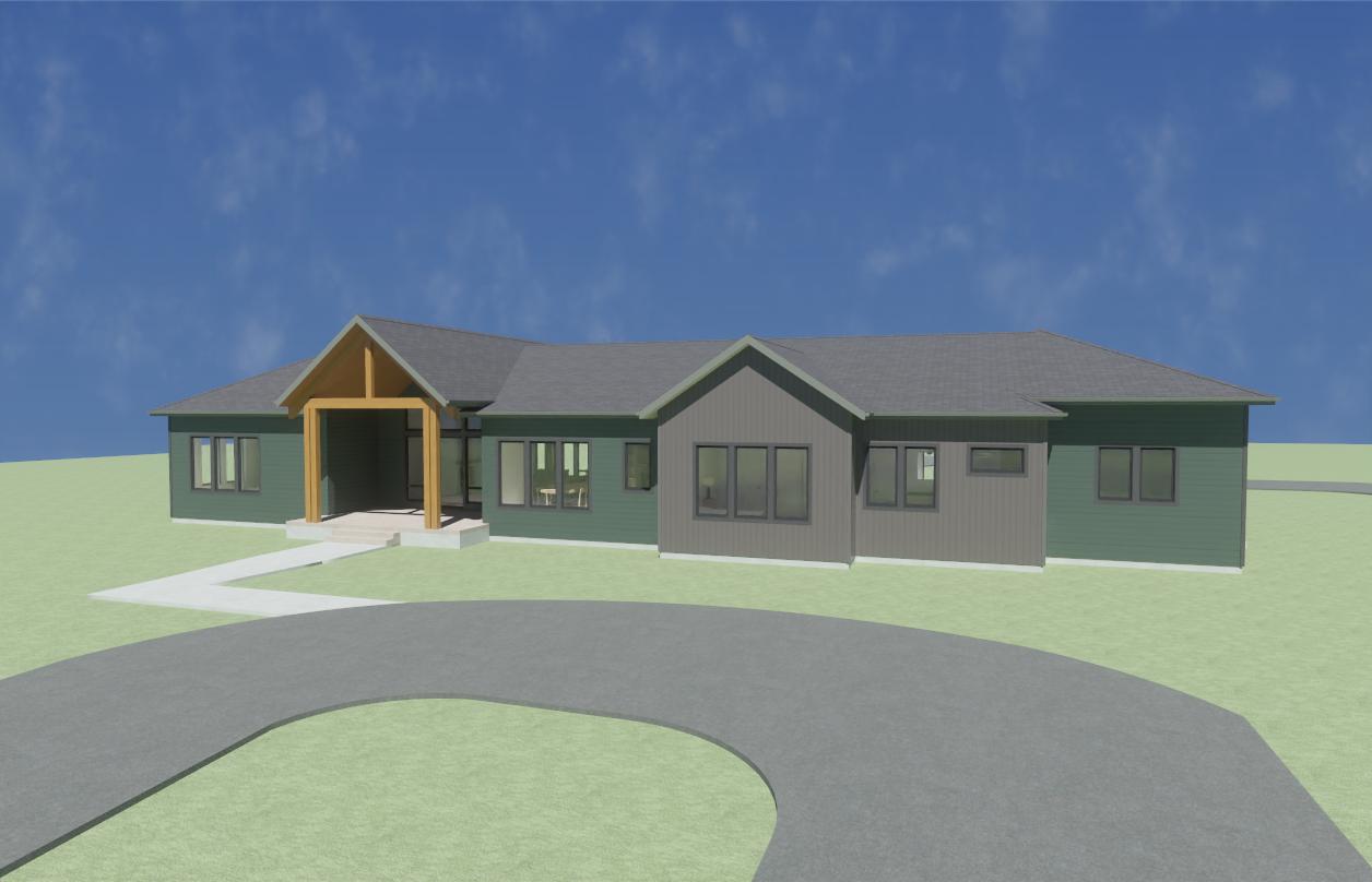 mountain modern single story house with a warm and inviting atmosphere featuring a green and gray exterior the house has a prominent wood framed gable entrance surround it with lush green grass and mix of landscape and hardscape and add a smooth asphalt driveway with concrete sidewalk leading to the entrance the sky is clear and bright blue with misty white clouds enhancing the tranquil and sunny setting set in a field in a valley