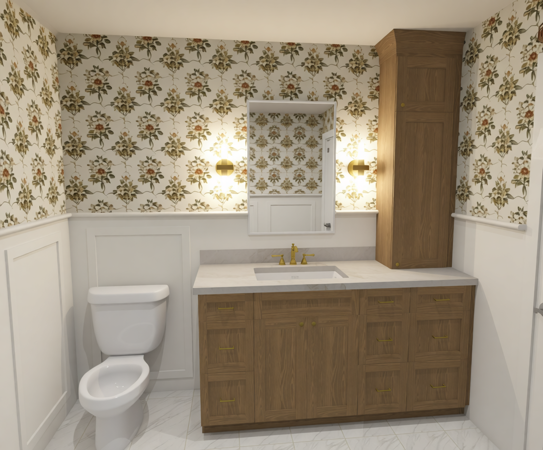 the cabinet hardware and faucet is polished nickel the sink is white porcelain match the colors in the provided image the space should be evenly well lit the shirts are hanging from a chrome rod