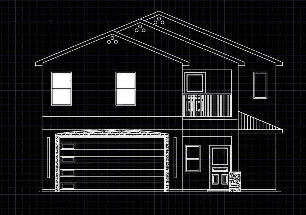 generate beautiful elevations renders with light inside with white stucco on front walls and black metal roof top down from above with sunlight at dusk