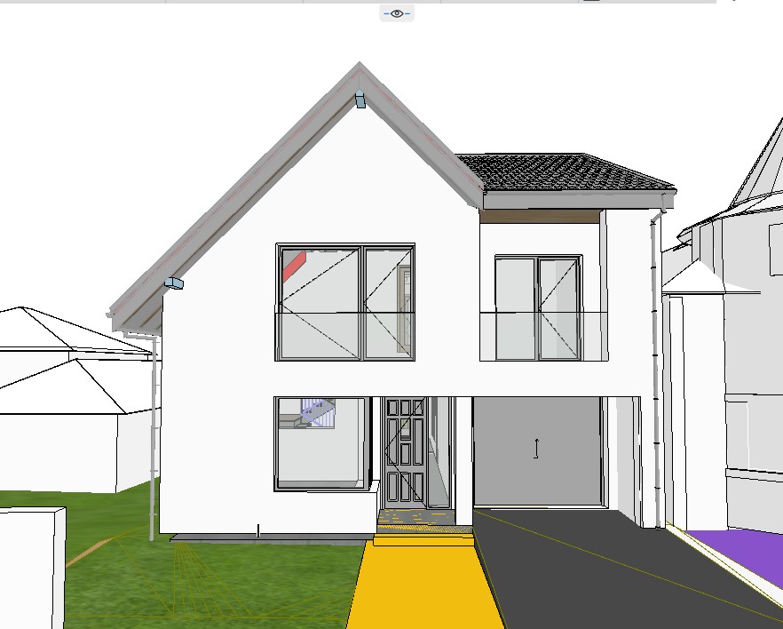 modernist exterior shot a beautifully rendered modern minimalist house set amidst a serene natural environment the house features angular wooden structures with a dark gray and black exterior large glass windows reflect the subtle hues of the surrounding landscape the wooden siding has warm earthy tones like soft browns and is combined with sleek contemporary black trimming the atmosphere is tranquil and the lighting is soft mimicking a gentle morning or late afternoon light the ground is adorned with patches of green moss and vivid yellow wildflowers adding a burst of color and life the surrounding trees are leafless drawn with delicate thin black lines indicating the late autumn season shadows of the trees create an intricate pattern on the house and the ground in varying shades of gray and brown the entire setting feels both modern and natural embracing simplicity and elegance architecture white facade ride side garaj door full grey middle door full grey yelow floor change tot paving grey