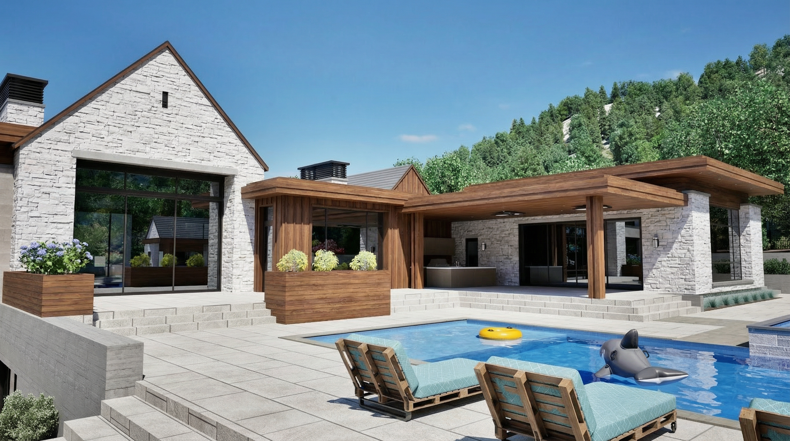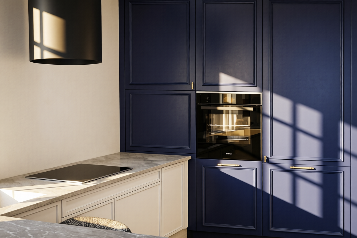 large transitional kitchen interior eye level perspective looking straight toward the island balanced and symmetrical composition kitchen features full height perimeter cabinetry in a soft blue gray tone clearly reading as cool toned blue with a subtle gray undertone matte painted finish the color is muted and refined not green not warm and not saturated cabinet doors are classic shaker style with clean recessed panels and subtle frame detailing all cabinetry hardware is in a warm brushed brass finish including pulls and knobs on the left wall tall integrated cabinetry with two panel ready refrigerators fully clad in matching blue gray millwork panels seamless and flush with surrounding cabinets adjacent tall pantry style cabinets continue the same finish and detailing the back wall features additional upper and lower cabinets in the same blue gray tone with a full height light stone slab backsplash in a soft off white tone with subtle natural veining continuous and uninterrupted behind all cabinets centered in the space is a large rectangular kitchen island the island base is finished in natural light oak wood with visible vertical grain and flat recessed panel detailing the island countertop is a light stone surface with soft veining slightly eased edges clean and minimal one side of the island includes integrated drawers with brass pulls the opposite side is a solid oak wood panel on the right side of the island three counter height stools with slim black metal frames and upholstered seats and backs in a muted green fabric are neatly aligned above the island hang two pendant lights each with a warm brass canopy and stem the pendants feature a pleated fluted white shade in a wide conical shape softly diffusing light downward flooring throughout the kitchen is wide plank natural oak wood flooring in a light neutral tone with subtle variation laid straight and evenly ceiling is white with multiple evenly spaced recessed round downlights providing soft even illumination no dramatic shadows neutral daylight balanced lighting on the right wall lower cabinets with drawers and upper cabinets above all in matching blue gray finish a window with white trim is centered above the counter dressed with a woven roman shade in light neutral tones at the far end of the kitchen a doorway leads to a pantry or secondary space with cabinetry visible beyond in a slightly darker blue gray tone overall style is clean refined transitional with subtle traditional detailing no people no styling accessories added no changes to colors materials proportions layout or lighting architectural illustration style with clean outlines and accurate scale