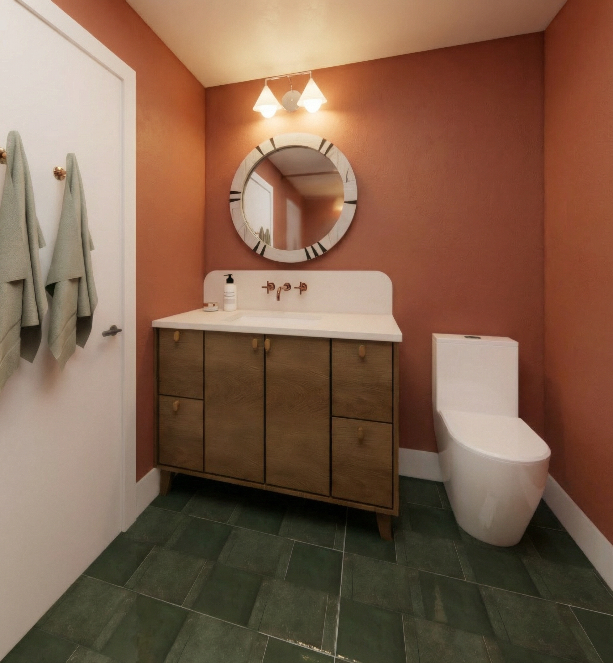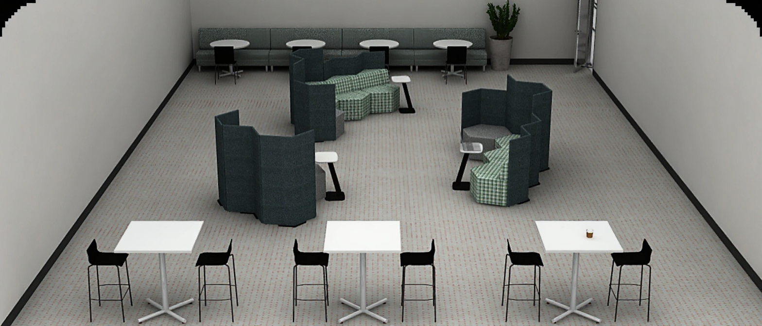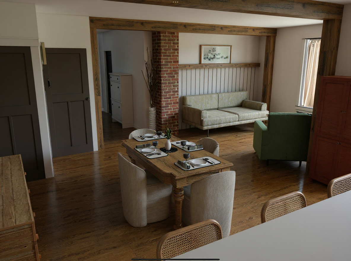 render the kitchen in perspective view the wall paint is af 630 the countertop and backsplash is lucent quartz droplets the cabinet colour is benjamin moore whitestone add led lighting under the upper cabinets make the floor a lighter carmel brown hardwood add pot lights in the ceiling open shelving to be a darker wood finish