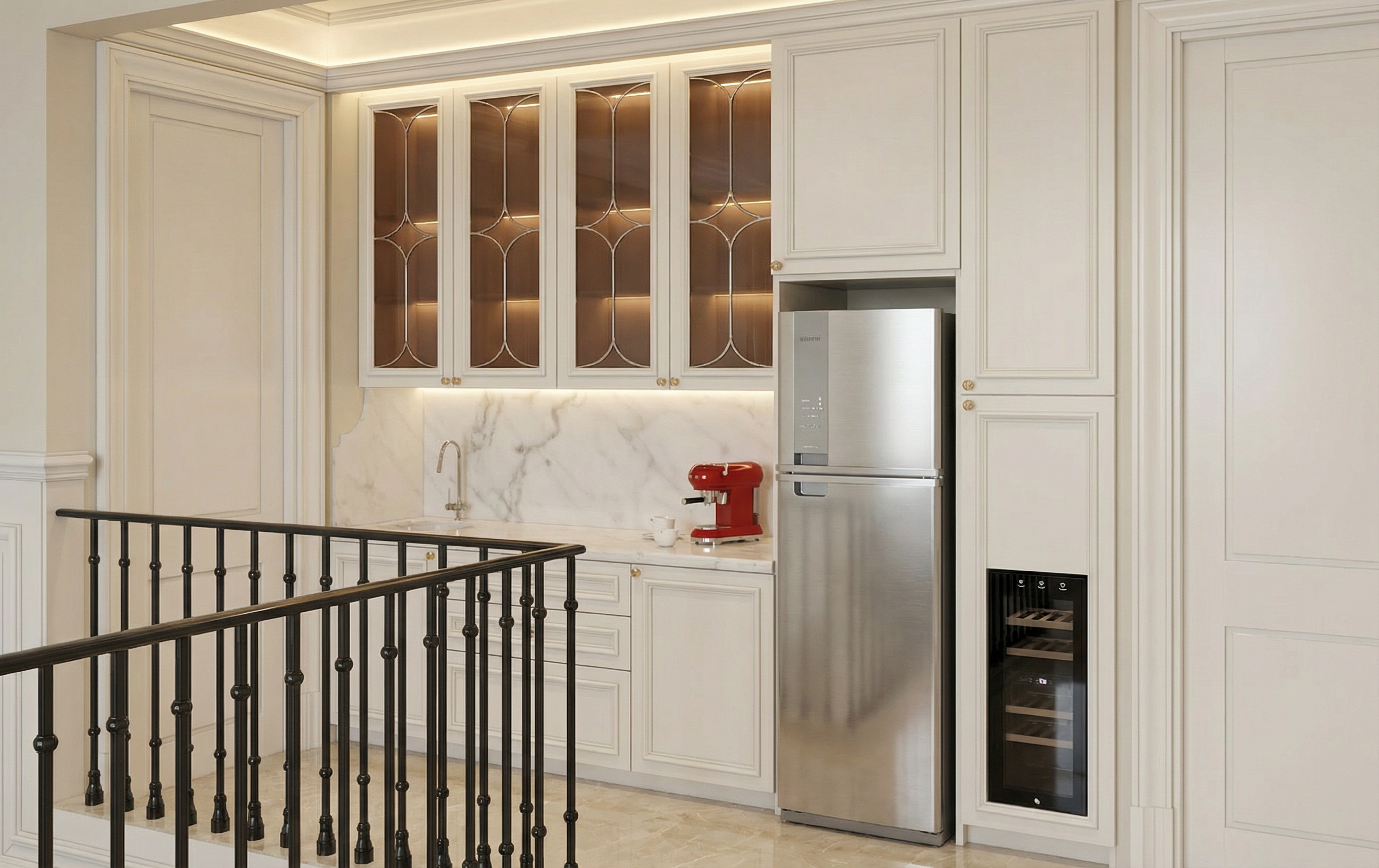 create ultra realistic images without altering any structure shape design or materials do not resize the jpeg use a glossy light beige marble texture for the floor white marble stone for the countertop and backsplash off white walls and plain beige kitchen cabinets do not alter the color material or shape black glossy cookerhood