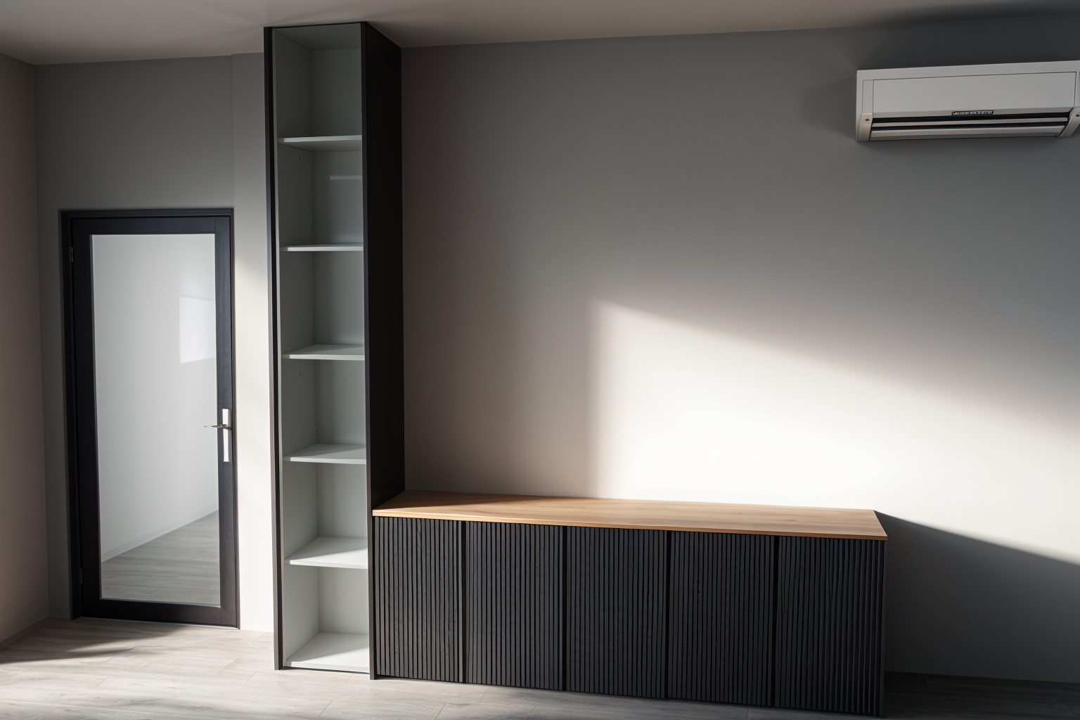 ultra realistic 3d render of a modern two story apartment with floor to ceiling glass windows flat concrete roof and wood panel ceiling commercial space in front with parking area rendered in cinematic lighting with soft shadows high detail textures 8k resolution architectural visualization style