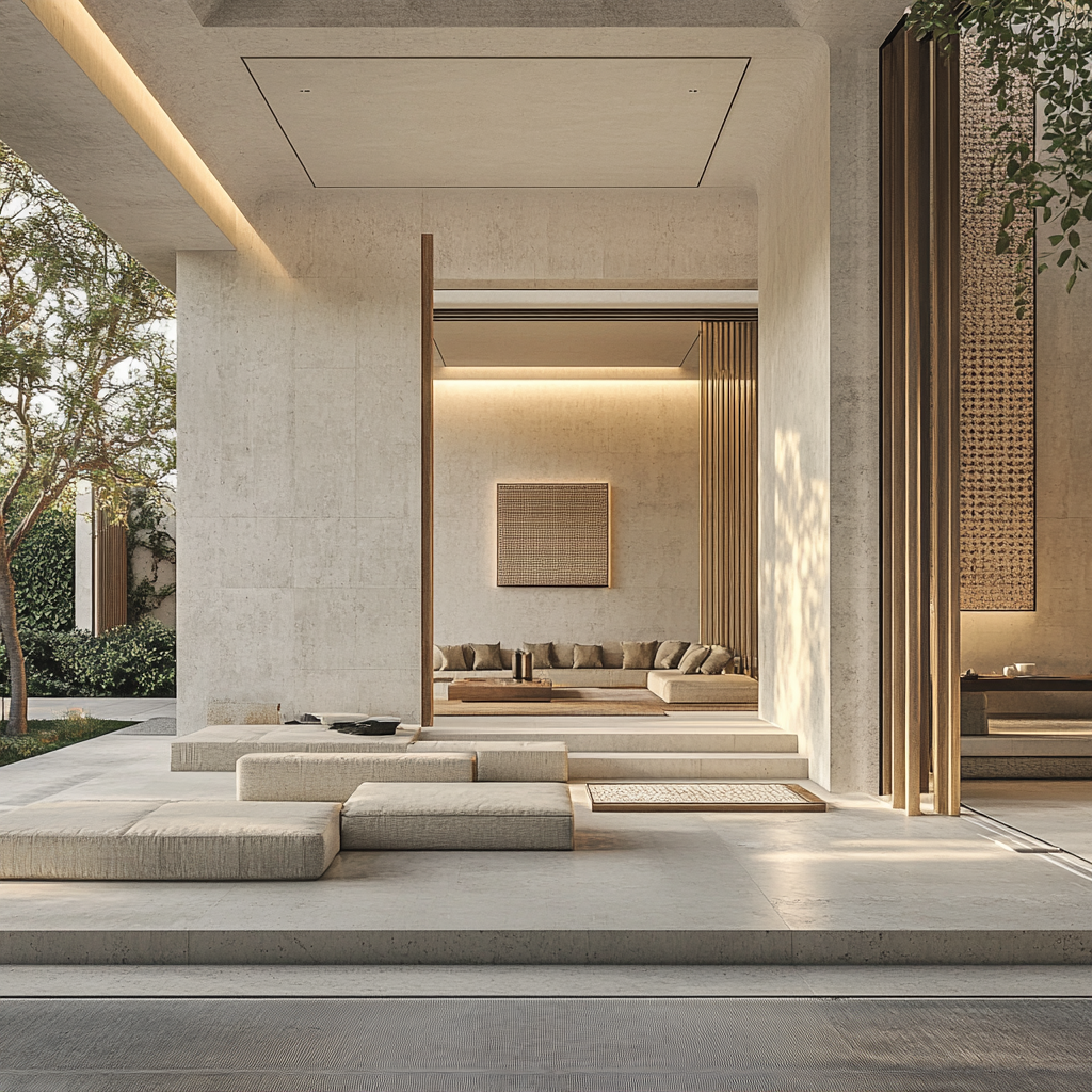 detail shot modern monolithic minimalist architecture light beige travertine walls framing an open gateway subtle islamic screens framing the entrance serene atmosphere a calm reflective pool in the foreground with a deep blue hue seamlessly merging into a tranquil ocean and an expansive sky in the background soft pastel pink and purple clouds in the sky gentle ambient light creating an ethereal glow