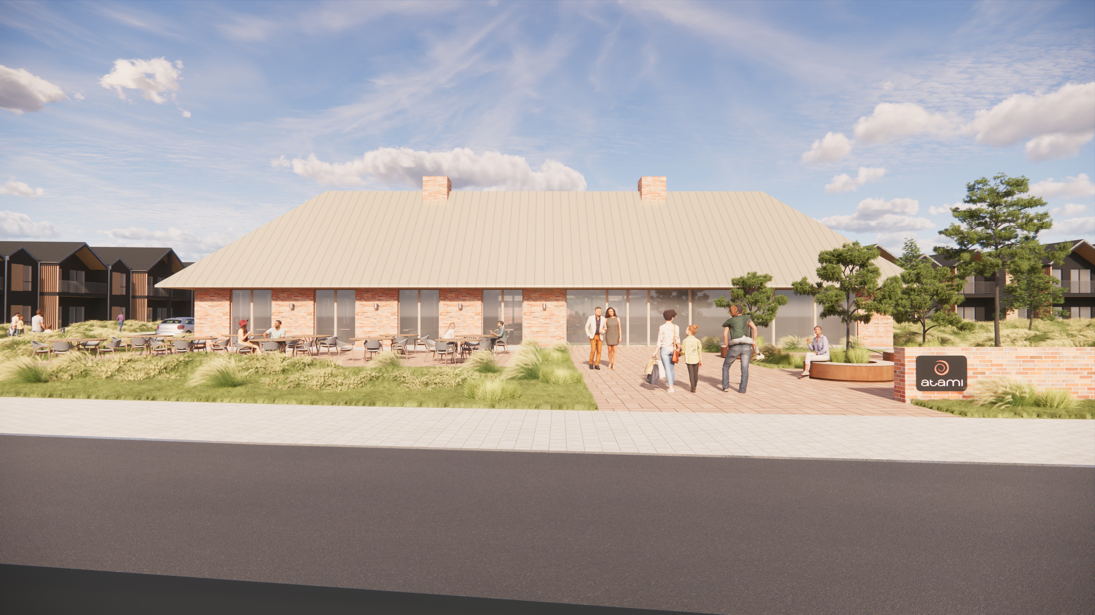 keep materials and colours soft lighting on facade and interior summer evening