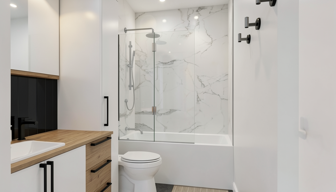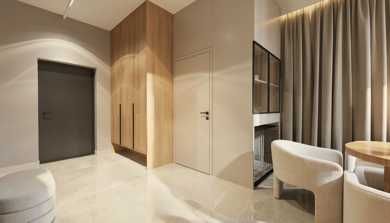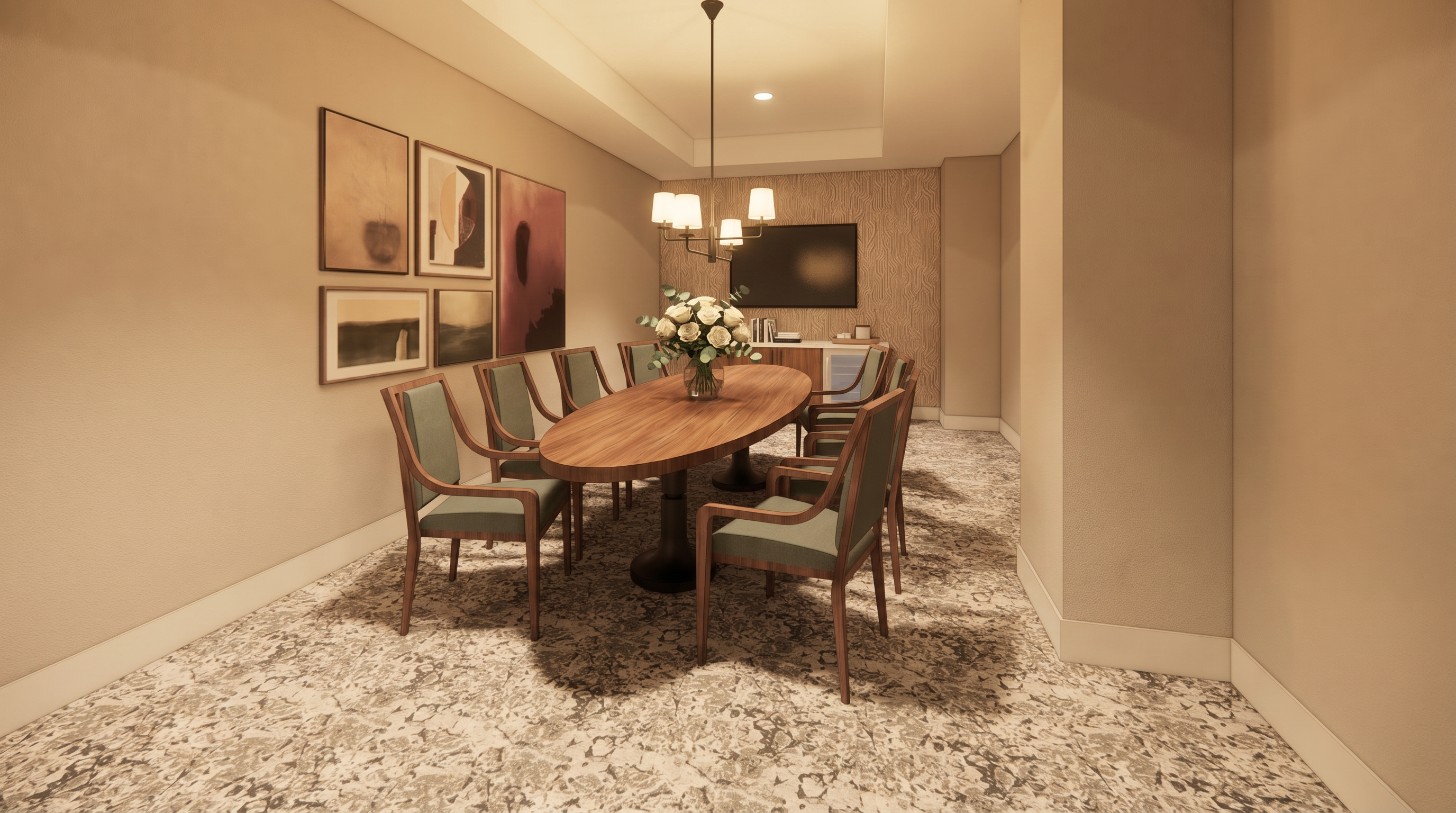 surround the building with a well kept suburban front yard featuring a lush green lawn neatly trimmed hedges along the foundation and mature shade trees lining the sidewalk add low flowering shrubs and a mulched planting bed near the entrance set under a bright clear afternoon sky with warm sunlight casting soft shadows across the yard and street keep concrete in front of entry gable